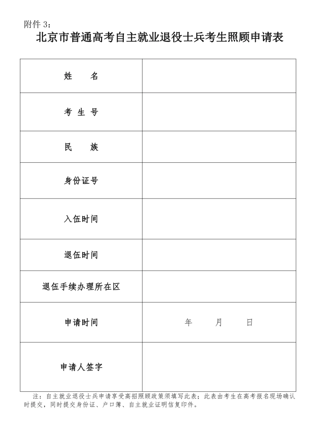 5.自主就业的退役士兵,须在高考报名现场确认时填写申请表(附件3)并提交身份证、户口簿、自主就业证明信复印件,由市退役军人事务局审核。