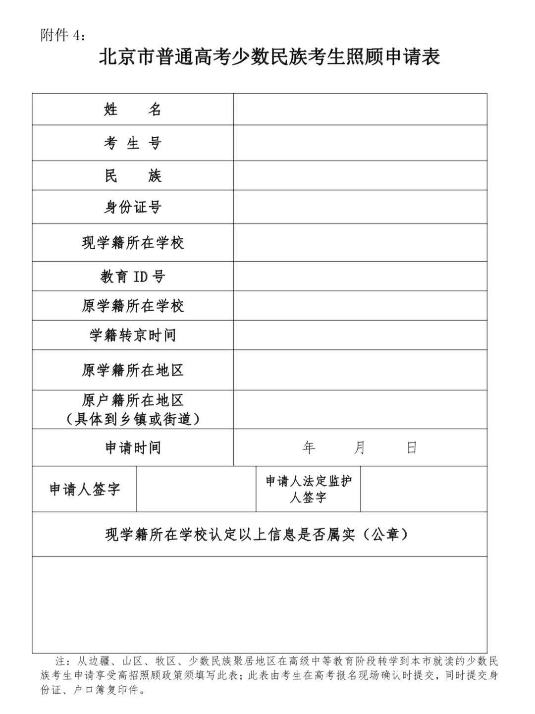 6.从边疆、山区、牧区、少数民族聚居地区在高级中等教育阶段转学到本市就读的少数民族考生须在高考报名现场确认时填写申请表(附件4)并提交身份证、户口簿复印件,由市教委等相关委办局和考试院共同核准。