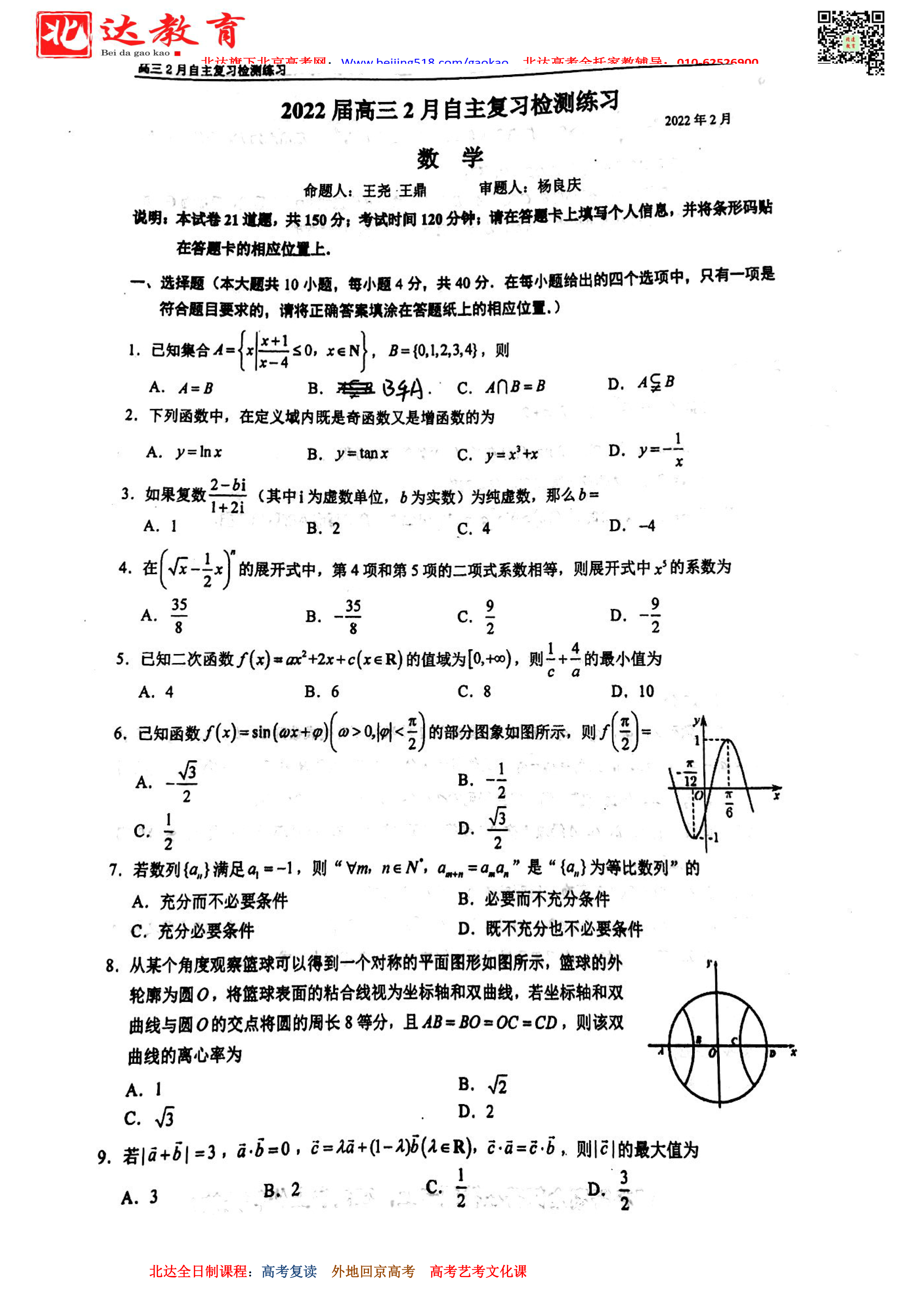 北达高考复读学校整理了2022届北京人民大学附属中学高三下学期2月(开学测)数学试题,分享给大家,希望对大家有所帮助。
