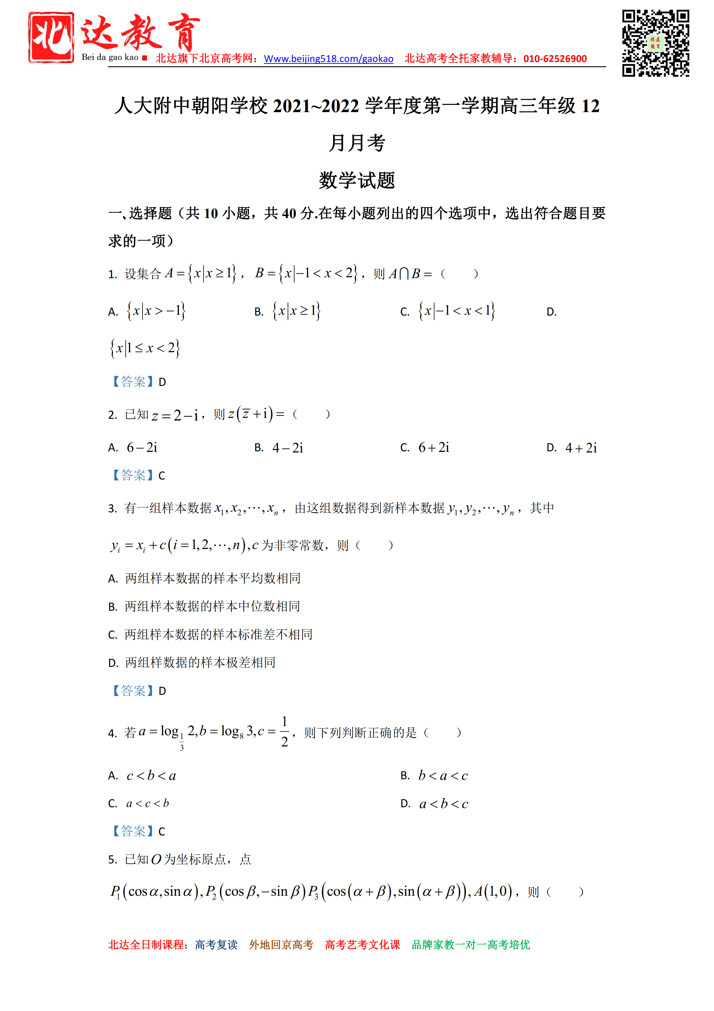 北达高考复读学校整理了2022届北京人大附中朝阳分校高三12月月考数学试题及答案,分享给大家,希望对大家有所帮助。