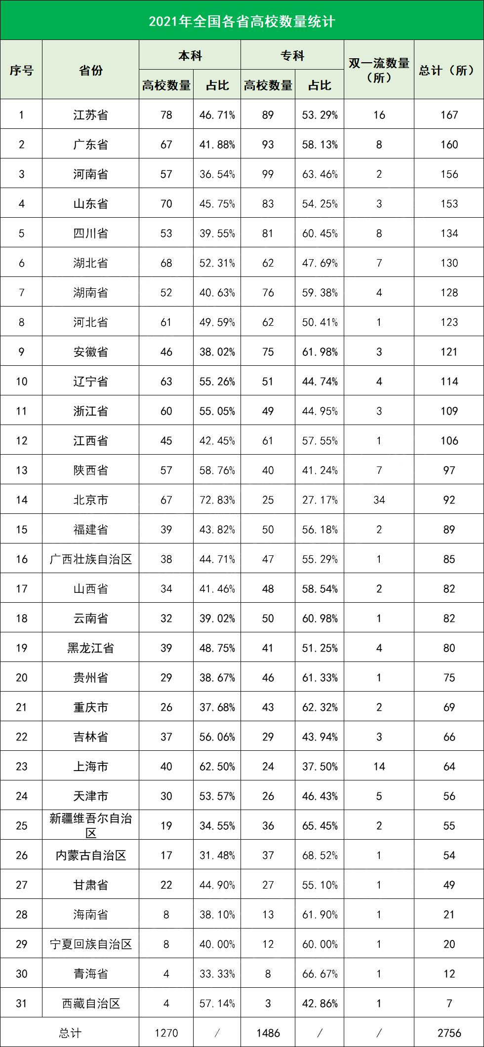 教育部公布了2021年全国高等院校名单,2021年全国各省高等教育水平如何?详情如下。