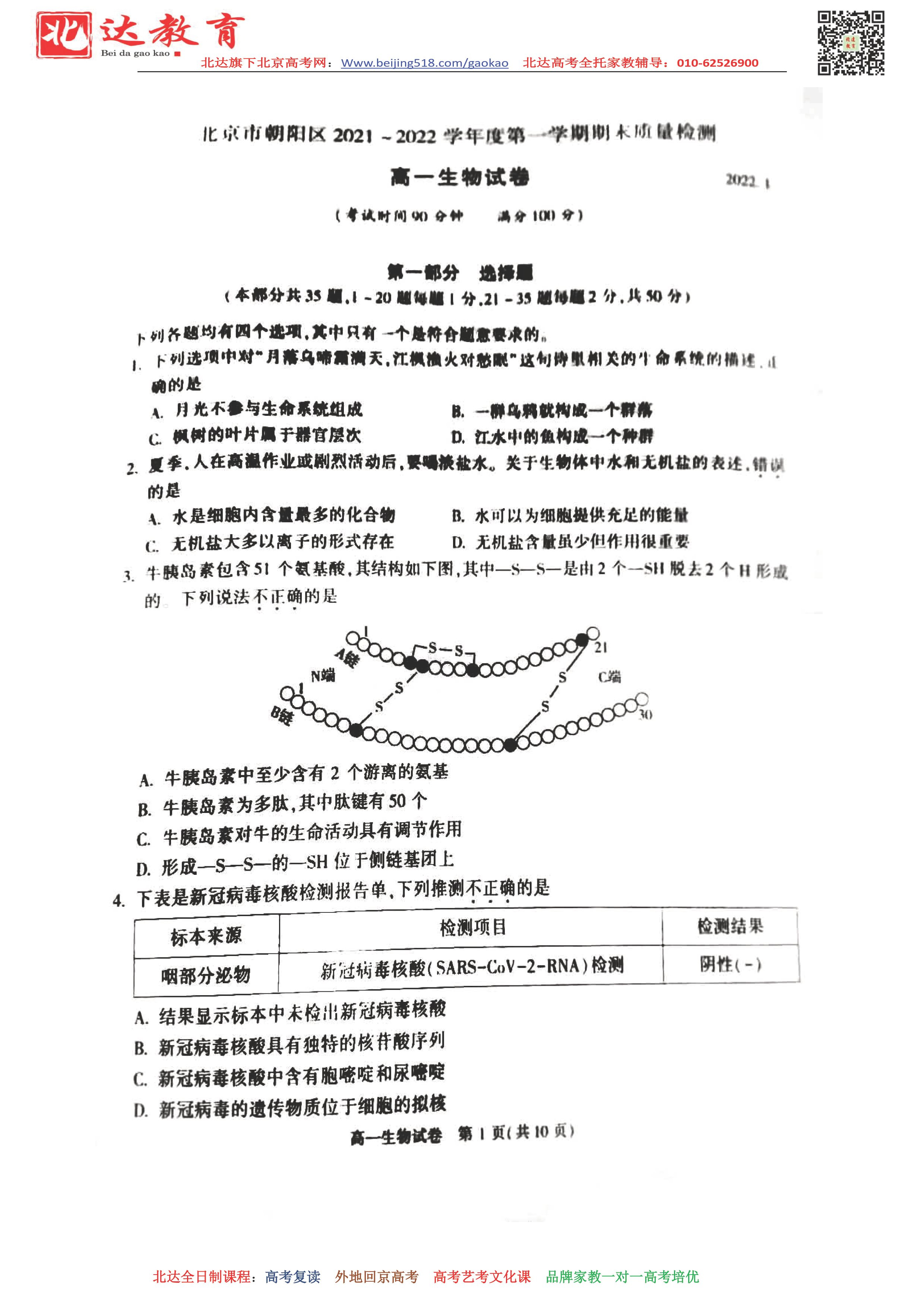 首页 高一资料 北京朝阳区2022年高一上学期期末生物试题