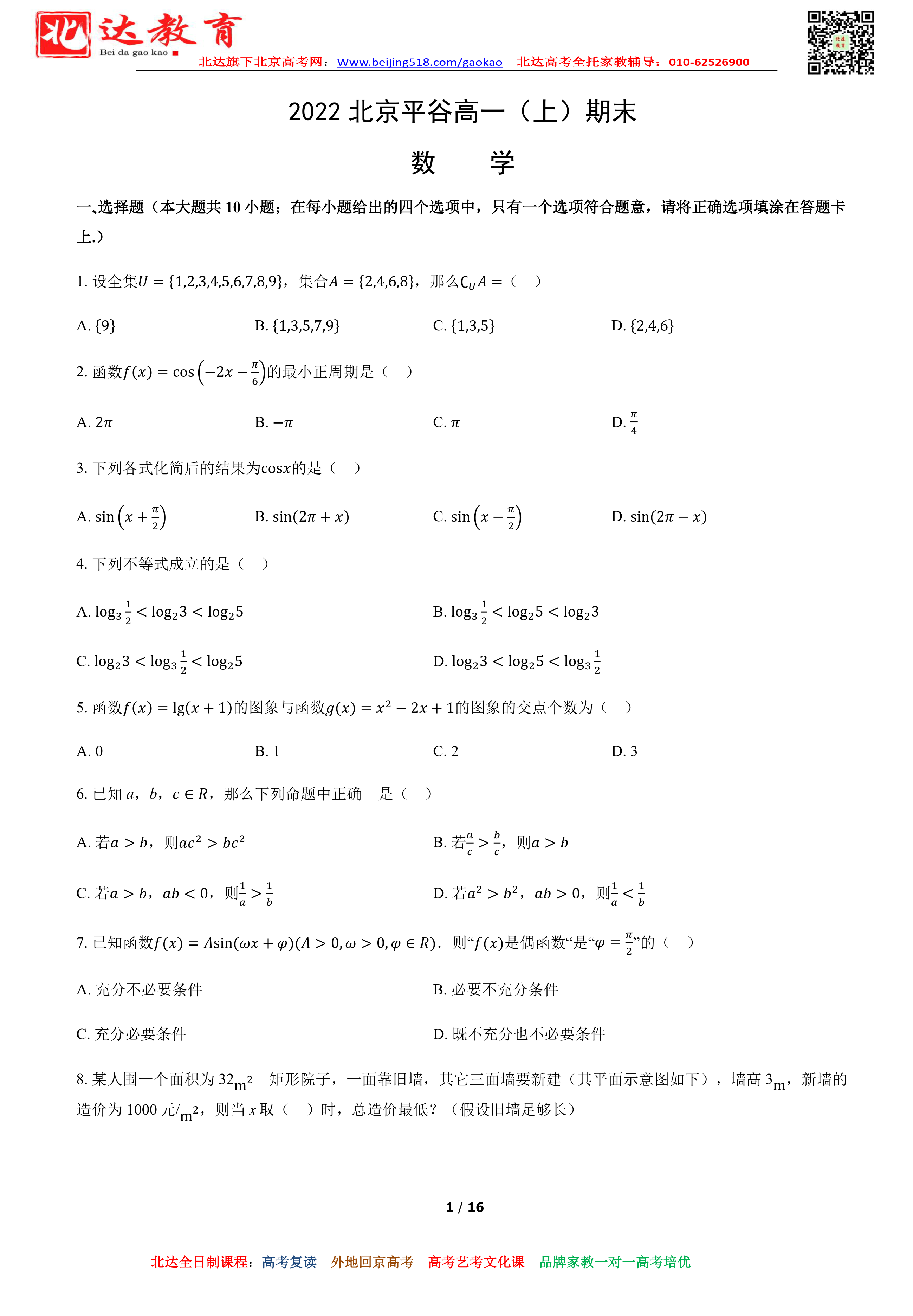 北京各区高一上学期期末考试时间已确定为1月12日-14日,北京各区2022年高一上学期期末考试结束之后,北达教育教研组将整理相关试题,同学们可以直接下载相关试题及答案。