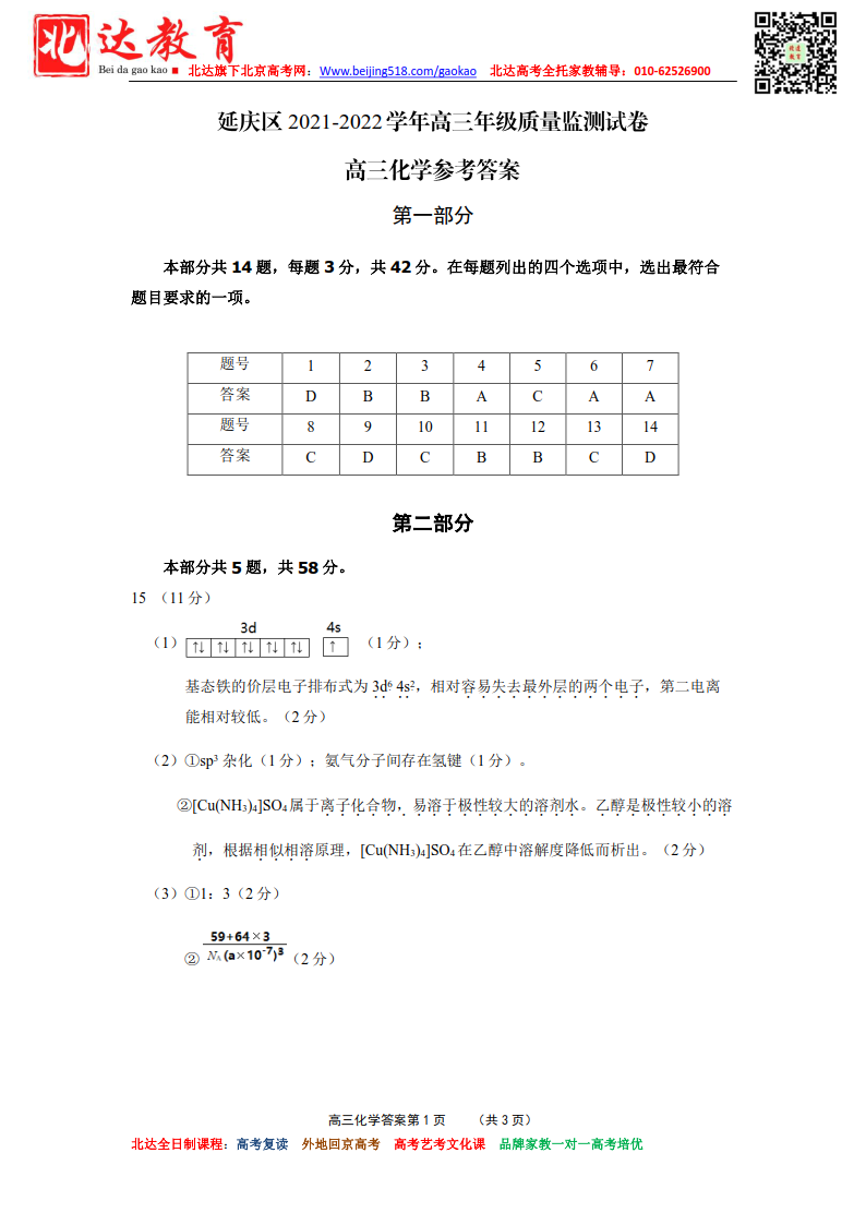 首页 高三资料 北京延庆区2021-2022学年高三一模化学试题答案