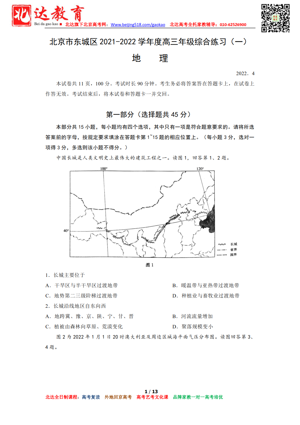 根据安排,3月28日-30日,2022年北京东城区举行高三一模考试,一模在形式和题量上更接近高考,因此同学们要格外重视,为了方便同学们下载复习,北京高考复读学校跟进相关试题,详情如下。北达高考复读、高考…