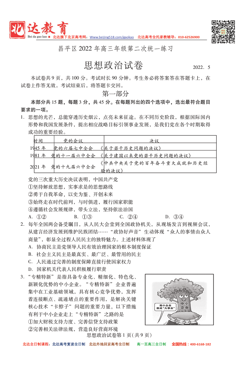 首页 高三资料 北京昌平区2021-2022学年高三二模政治试题及答案