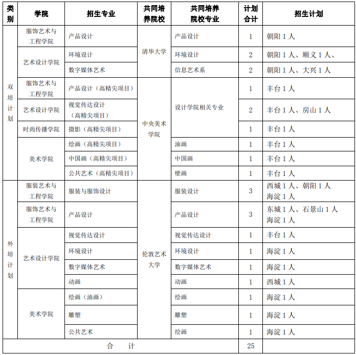 北京服装学院2022年招收双培外培招生计划(艺术类专业)