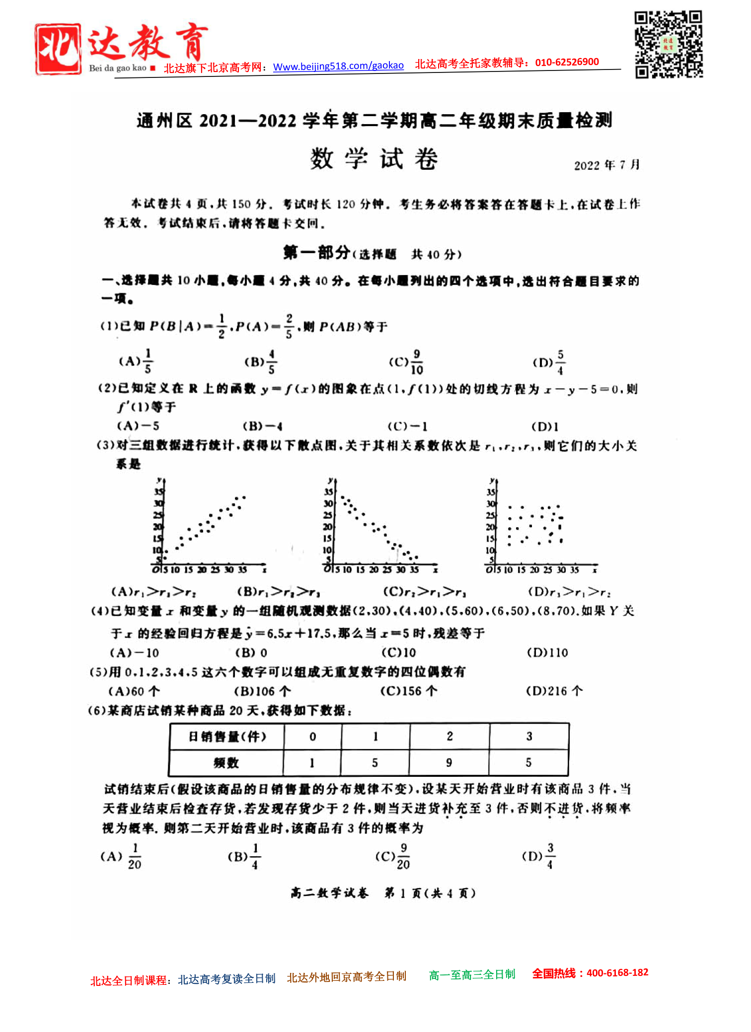 近日,北京北达教研组为大家整理了2022北京通州区高二下学期期末考试数学试题,需要的小伙伴赶紧下载吧。
