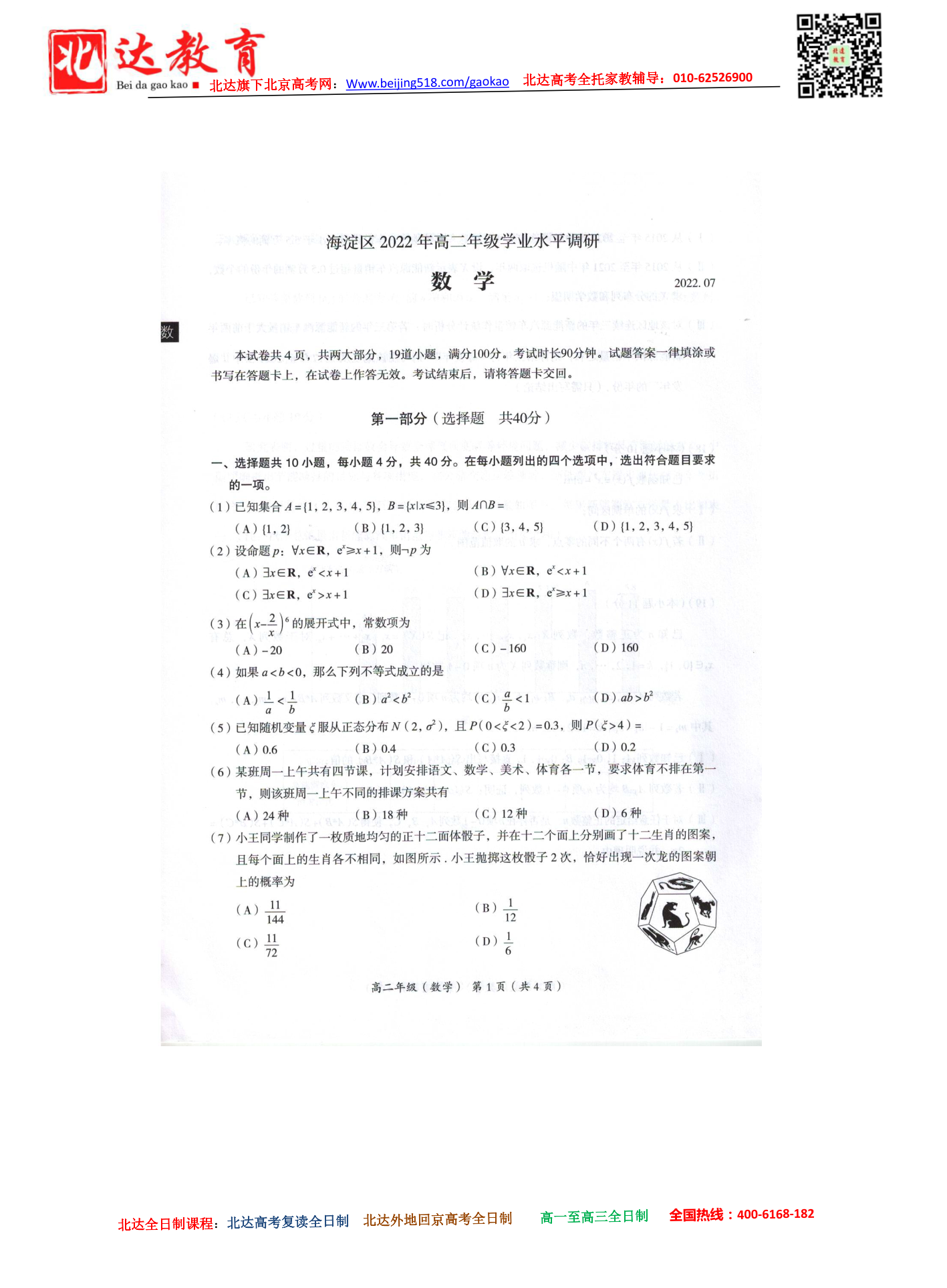 近日,北京北达教研组为大家整理了2022年北京海淀区高二下学期期末考试数学试题,需要的小伙伴赶紧下载吧。