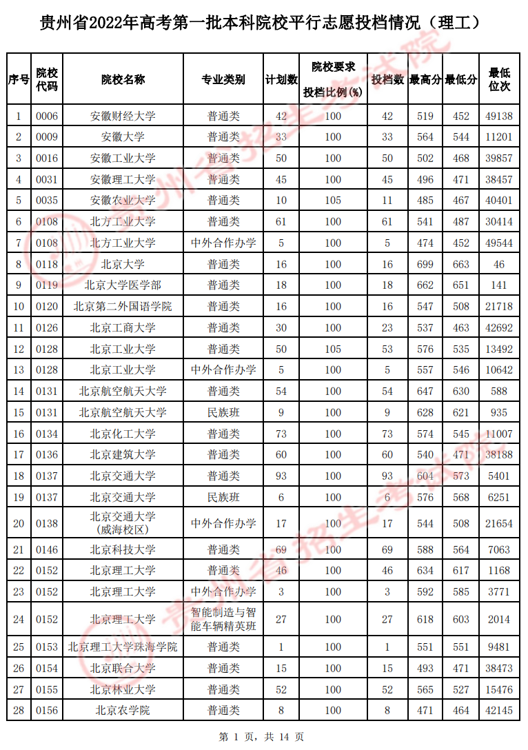 2022年贵州省高考本科一批投档分数线(理科)公布,北京北达教研组整理了具体的分数,数据详情如下: