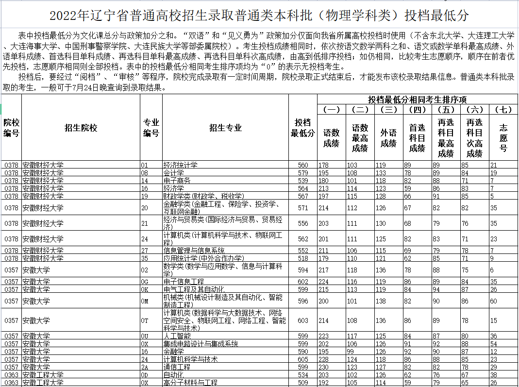 辽宁省2022年普通高校招生录取普通类本科批投档最低分数线(首选物理)