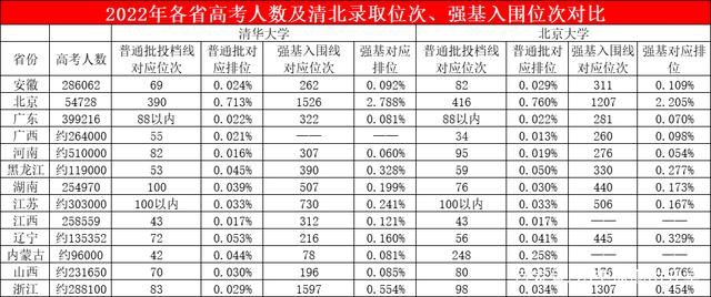 北大方面情况类似:在安徽强基对应排位为0.109%,是普通批的3.79倍;在广西强基对应排位为0.098%,是普通批的7.65倍;强基对应排位为0.328%,浙江强基对应排位0.454%,是普通批的13.33倍。