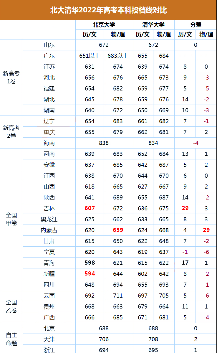 文科类:北大比清华分高只有1个地区,剩余地区全部都是清华比北大高,平均高8-10分,吉林甚至高达29分,很明显,北大在吉林报空断档。除此之外,湖北、河南、陕西、青海、贵州两校分差都超过10分以上。