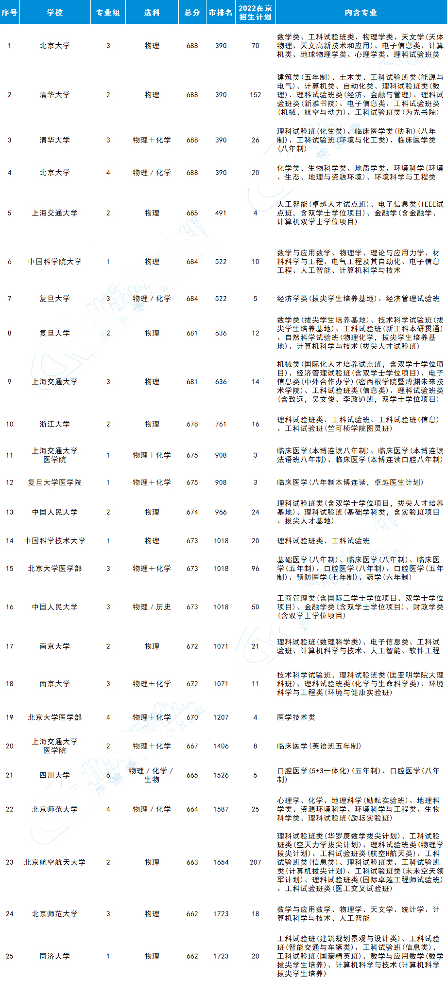 要求必选物理+化学:多是一些医学类、与化学相关的专业等。整体的招生人数较少,其中北京大学医学部招生人数最多,2022计划招生人数多达96人。