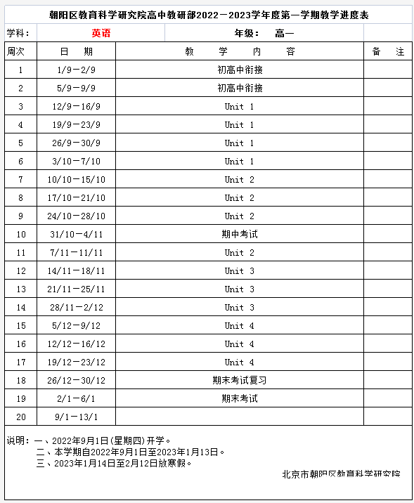 日前,朝阳区教育研究中心公布了《高中2022-2023学年度第一学期进度表》,详细介绍了第一学期每门科目每月的教学进度,北京北达教研组为大家整理的是 2022北京朝阳高一第一学期(英语)教学进度表,一起来看。
