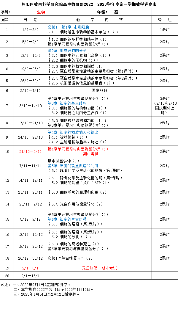 日前,朝阳区教育研究中心公布了《高中2022-2023学年度第一学期进度表》,详细介绍了第一学期每门科目每月的教学进度,北京北达教研组为大家整理的是北京朝阳区2022高一第一学期生物教学进度表,一起来看。