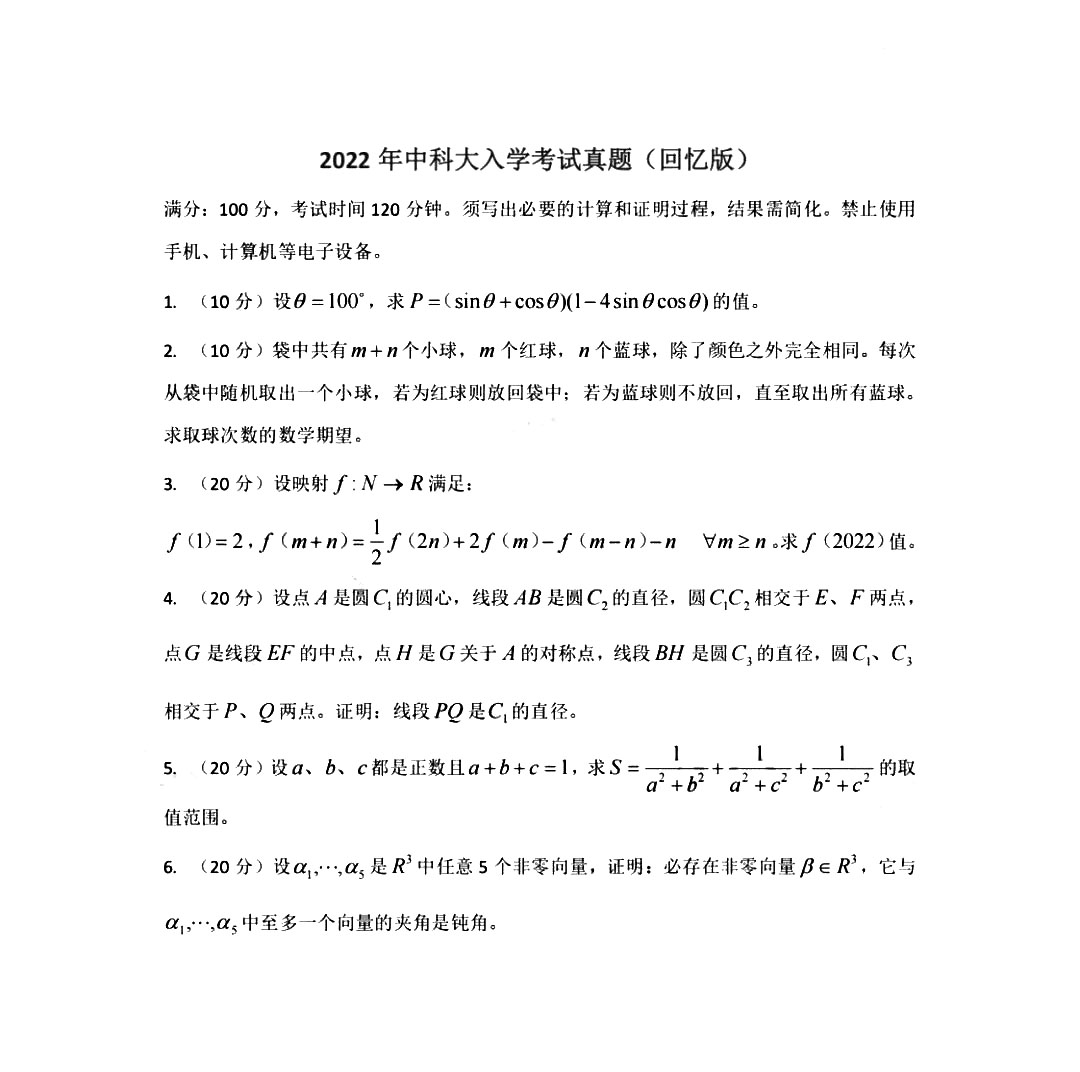 中科大的新生入学考试是该校的“优良传统”,目的是通过学校自命题来综合全面的筛查新生的综合素质,从而有针对性地分流和因材施教,毕竟高考的知识在于对浅显课本知识的不断重复,但大学却需要选拔更具有创新思维、独特天赋和全面综合素质的复合型、专业型人才。以下是北京北达教研组为大家整理的2022年中科大入学考试真题。