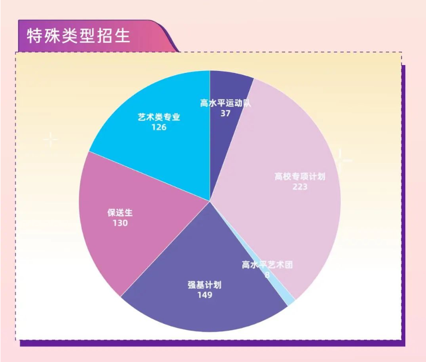 武汉大学2022年共录取本科新生7393人,其中,特殊类型招生共674人,占比9.1%。包括强基计划149人,保送生130人,高校专项计划223人,高水平艺术团8人,艺术类专业126人,高水平运动队37人。