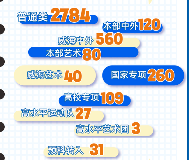 普通类招生2784人,占比66.9%,本部中外专业招生120人,威海中外专业招生560人,本部艺术专业80人,威海艺术专业40人,国家专项260人,高校专项109人,高水平运动队27人,高水平艺术团3人,预科转入31人。