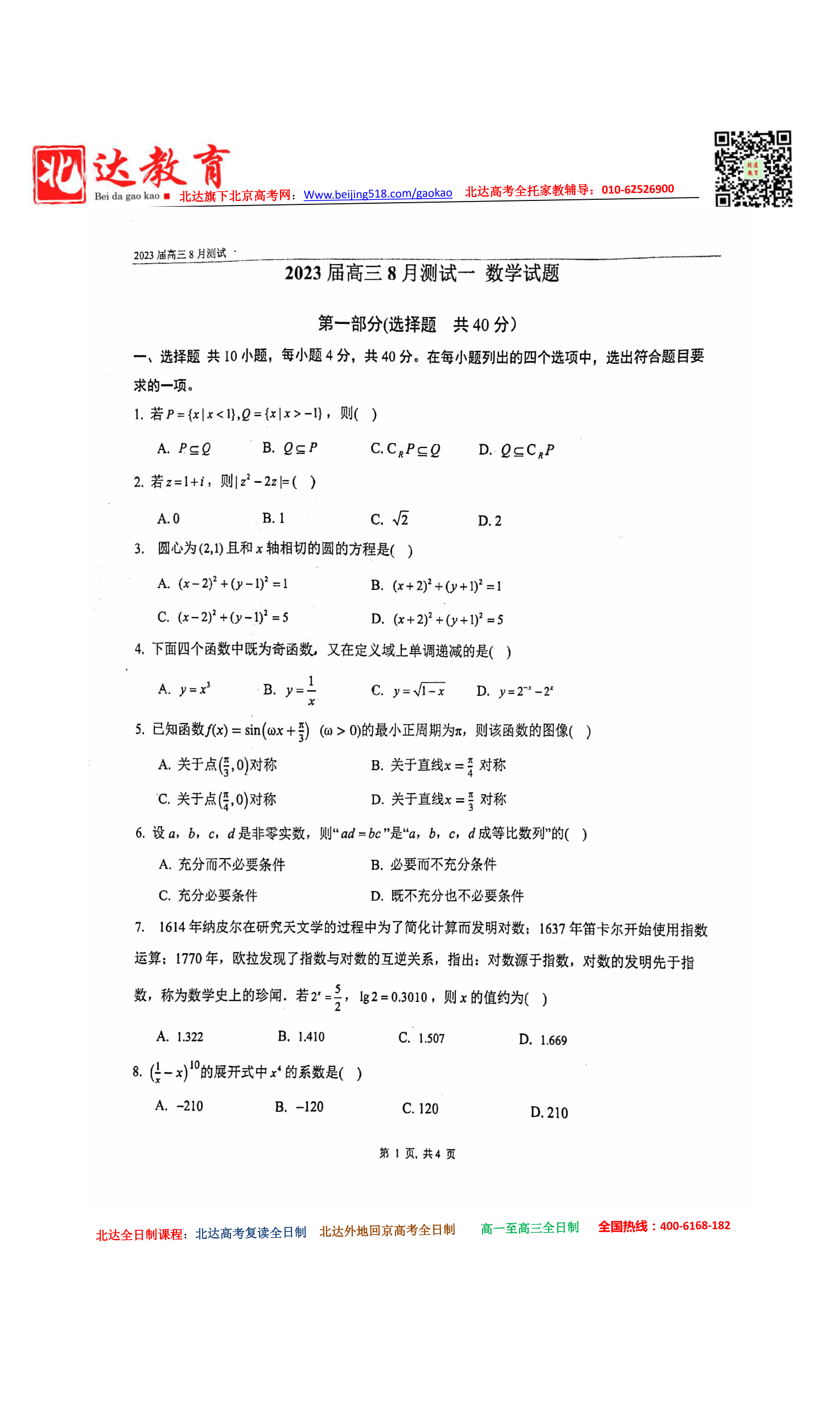 北京北达教研组为大家整理了2023届北京八中高三8月月考数学试题,一起来做做看吧。
