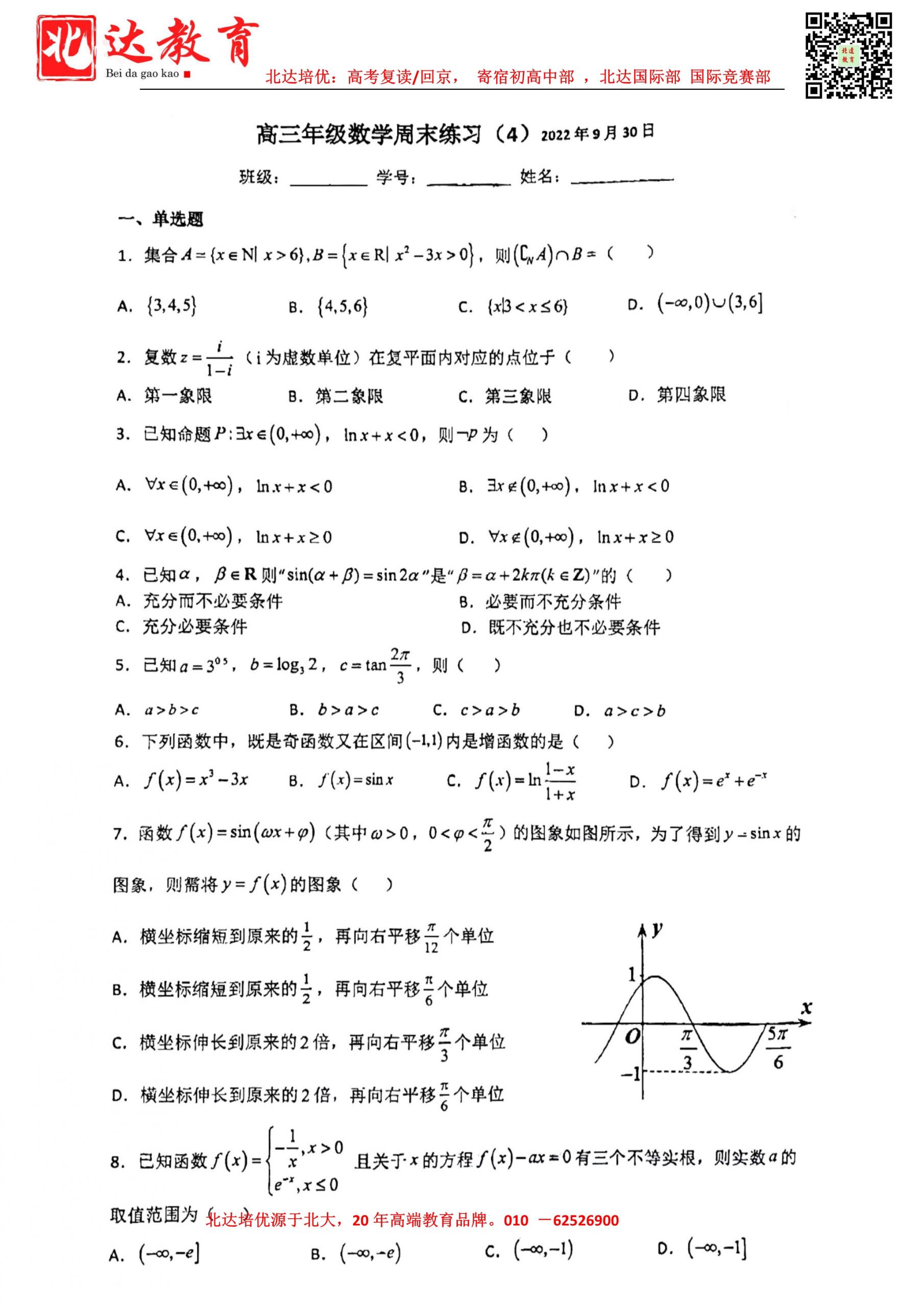 下载地址:2022年北京人大附中高三数学(周末练习4)9月试题