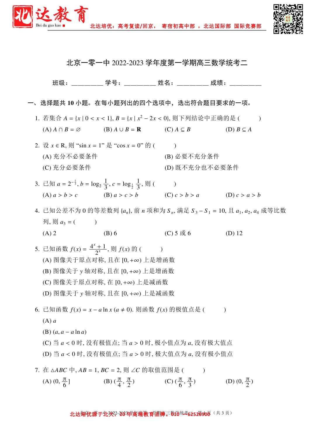 今天,北京北达教研组为大家整理了北京一零一中2022-2023学年度第一学期高三数学统考二试题,一起来看。