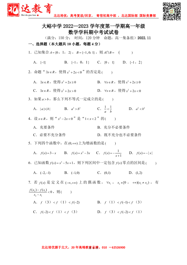 北京北达教研组为大家整理了2022-2023学年北京大峪中学高一(上)期中数学试题,分享给大家,赶紧下载练习起来吧。