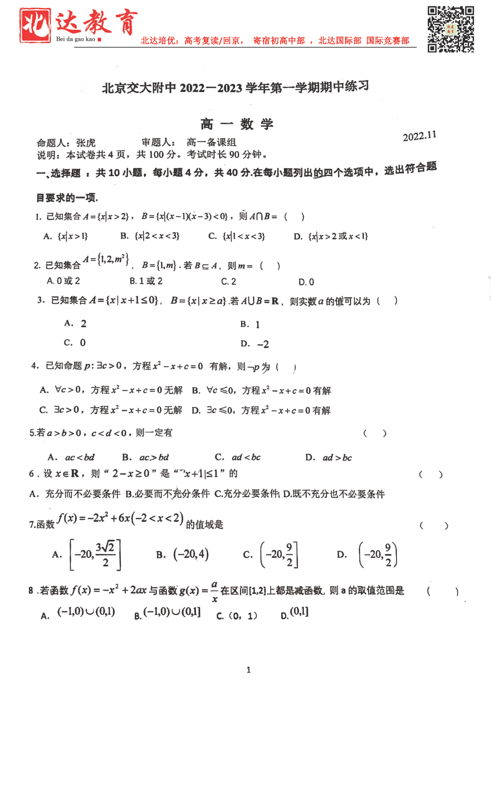 北京北达教研组为大家整理了2022-2023学年北京交大附中高一(上)期中数学试题,分享给大家,赶紧下载练习起来吧。