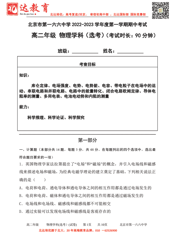北京北达教研组为大家整理了2022-2023学年一六六中学高二(上)期中物理试题(选考),分享给大家,赶紧下载练习起来吧。