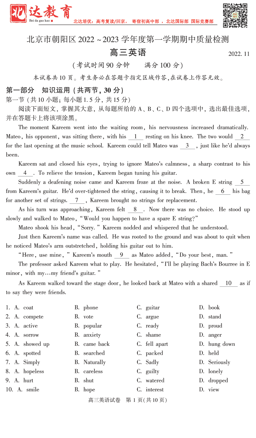 北京北达教研组为大家整理了2022-2023学年北京朝阳区高三(上)英语期中试题及答案,分享给大家,赶紧下载练习起来吧。