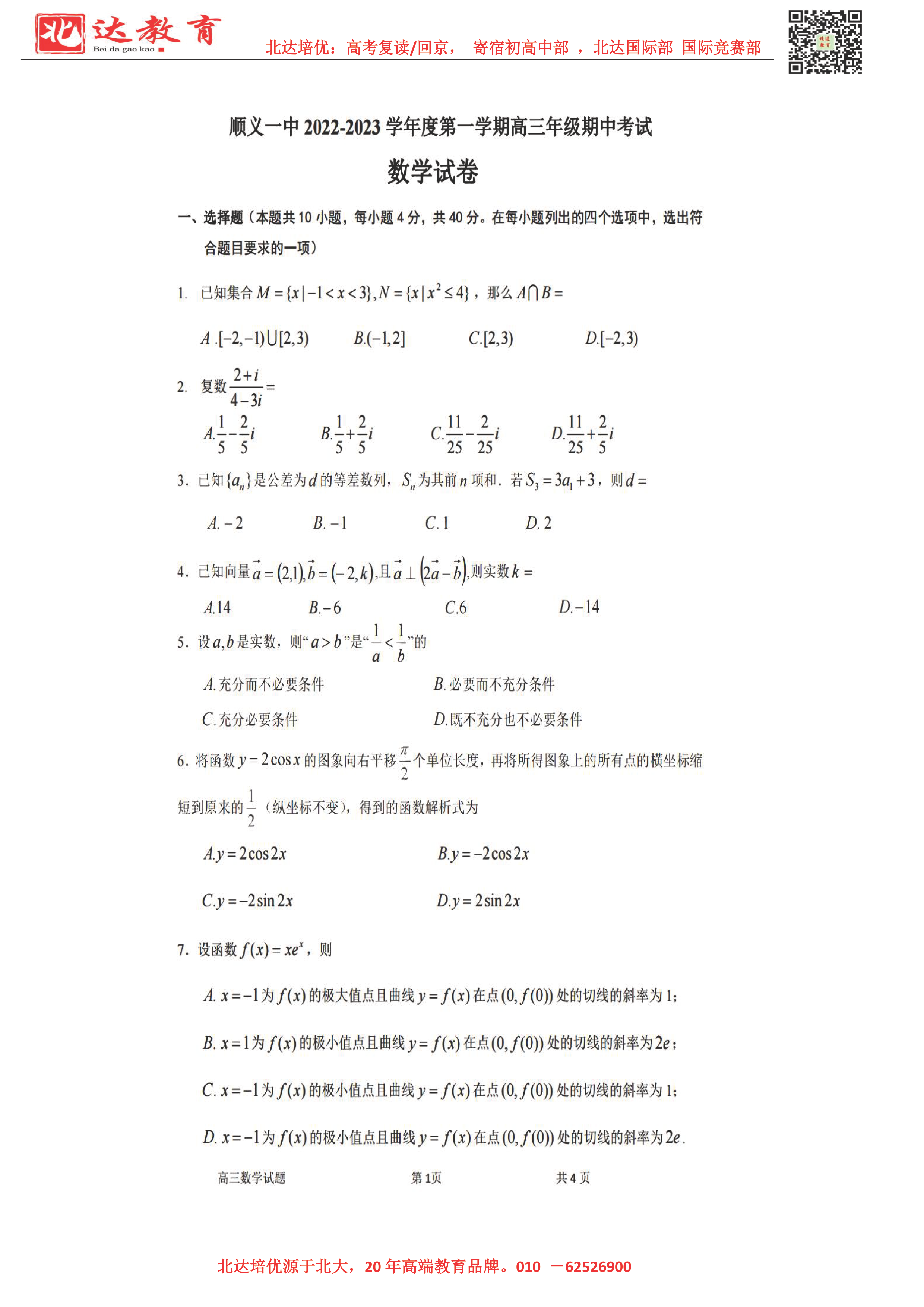 2023北京各区高三3月月考已进行,北达高考复读学校整理了2023北京顺义一中高三3月月考数学试题,同学们可以在线下载学习!