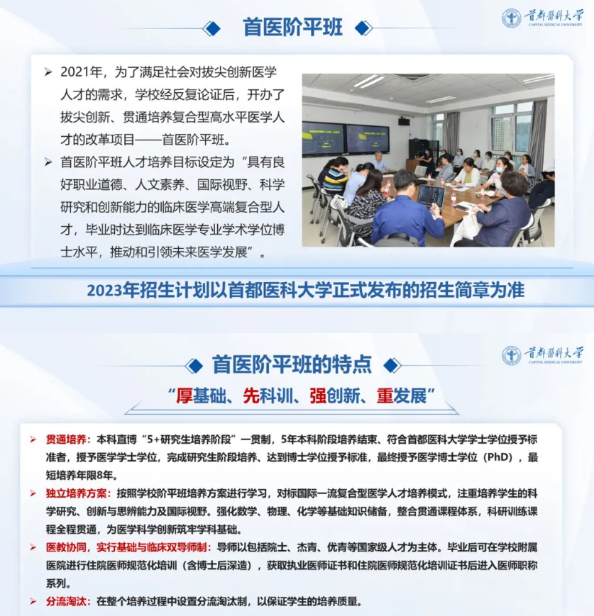 临床医学、口腔医学专业(阶平班):为了满足社会对拔尖创新医学人才的需求,学校从2021年开始招收临床医学专业(阶平班)与口腔医学专业(阶平班),即本科直博“5+研究生培养阶段”一贯制(PhD-学术型博士学位)的培养模式,突出“厚基础、先科训、强创新、重发展”,学生完成5年的本科学习后,以硕博连读的方式,直接进入直攻博研究生培养阶段,毕业时达到临床医学专业/口腔医学专业学术学位博士水平的高层次医学专门人才(PhD)。