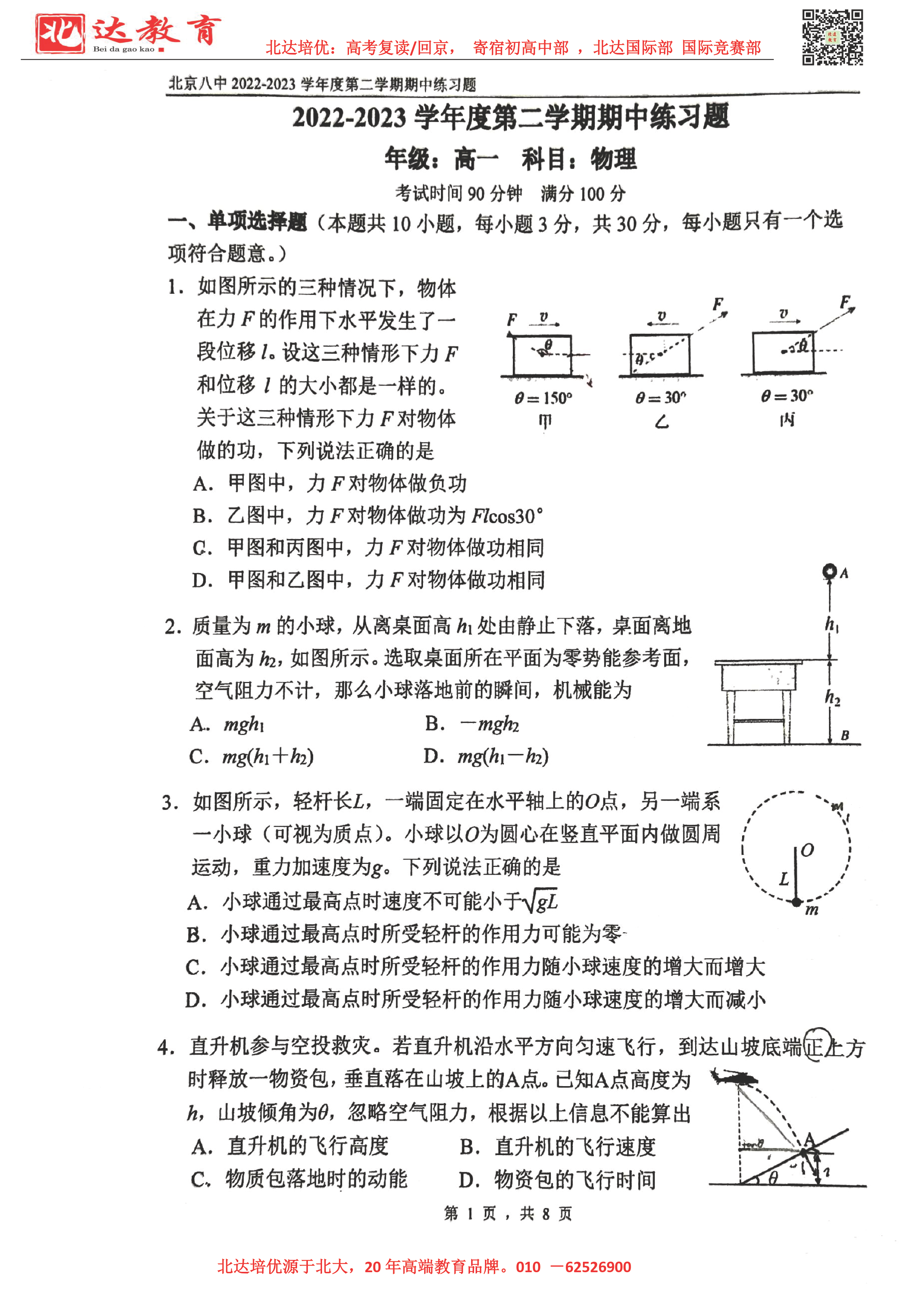 2022-2023学年北京各区高一年级下学期期中考试已开始,北达高考复读学校整理了2022-2023学年北京八中高一(下)期中物理试题,供同学们在线下载!