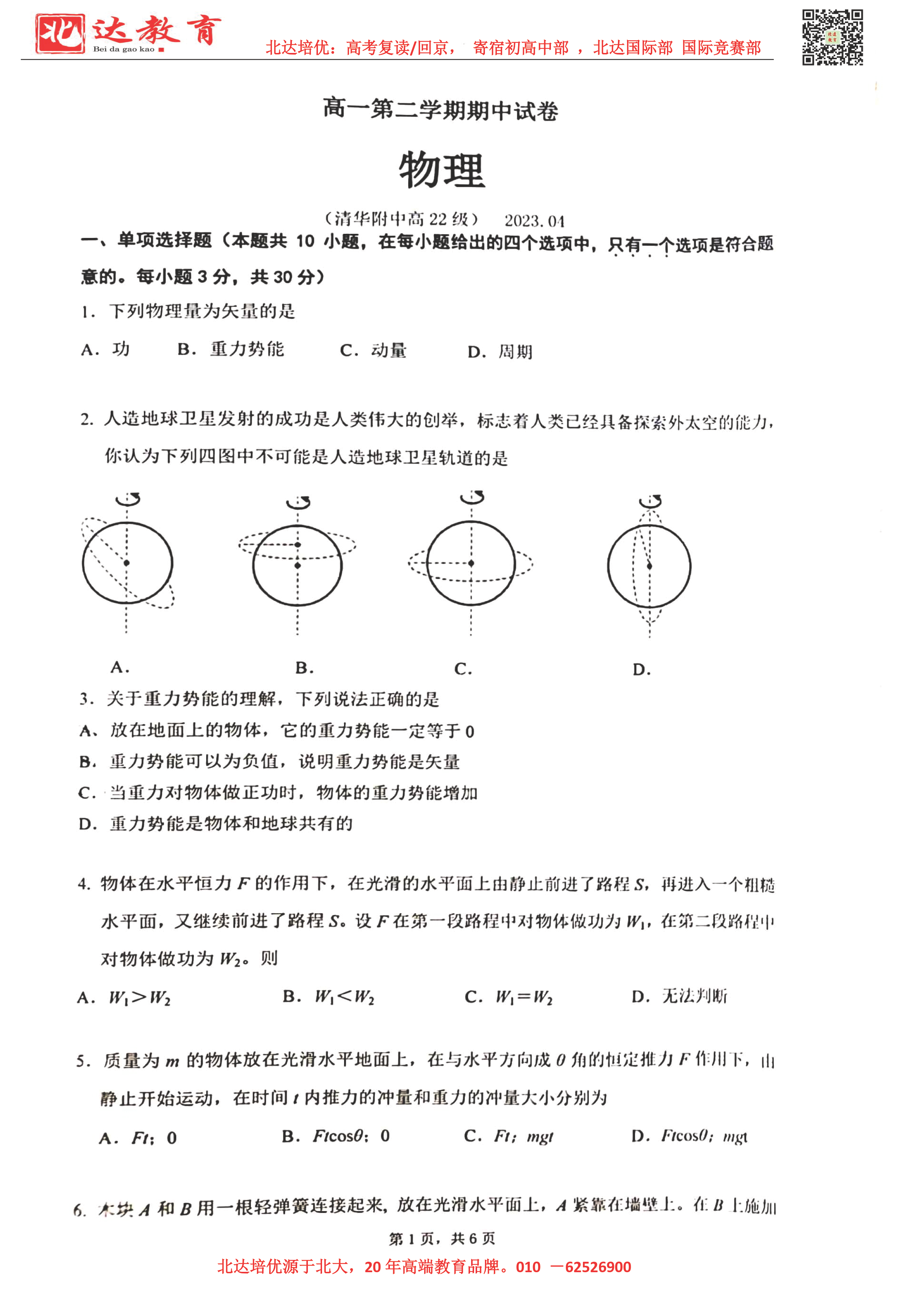 2022-2023学年北京各区高一年级下学期期中考试已开始,北达高考复读学校整理了2022-2023学年北京清华附中高一(下)期中物理试题,供同学们在线下载!