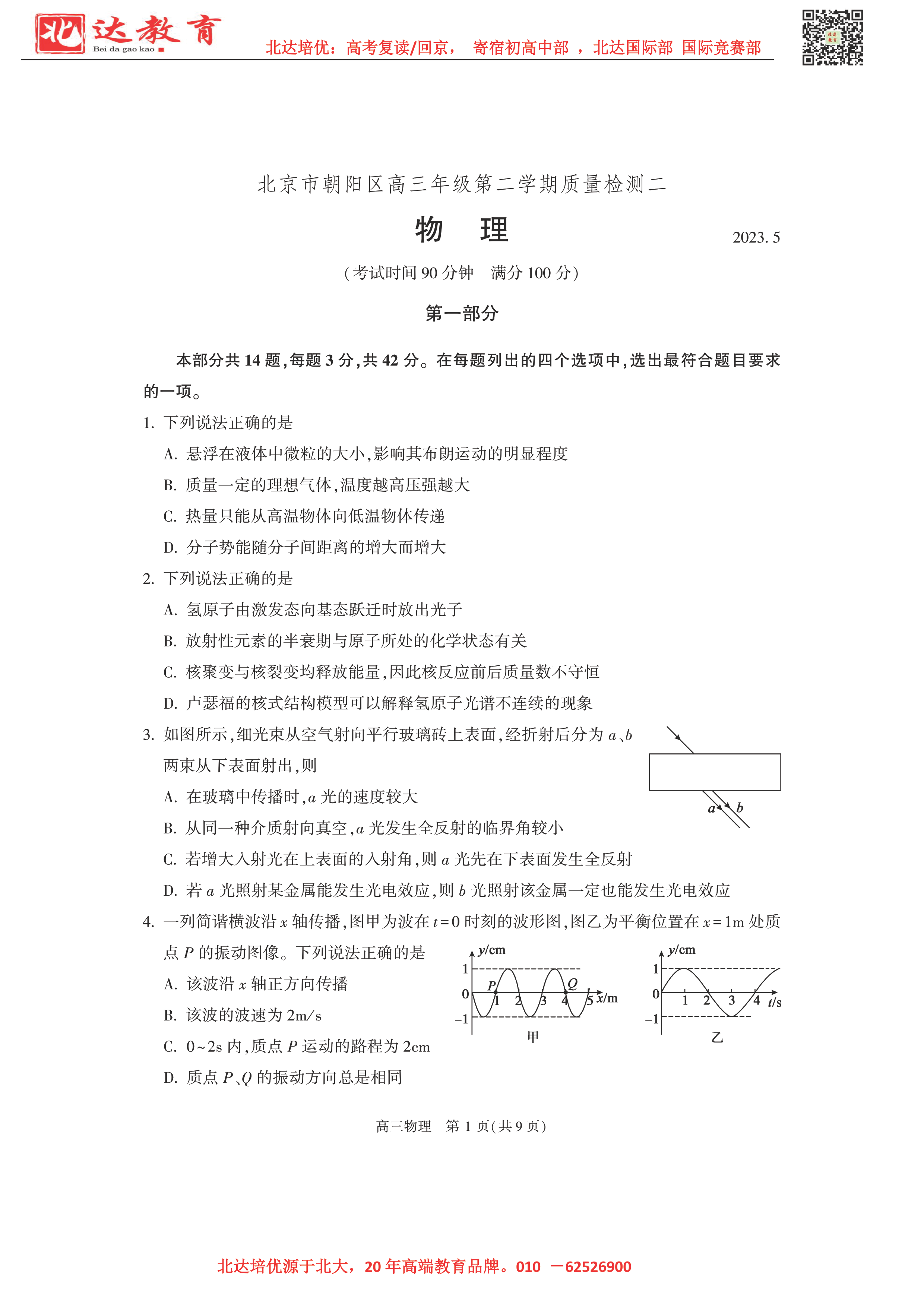 2023年北京朝阳区高三二模考试于5月4日开考,为了方便同学们查找相关试题及答案,北达高考复读学校整理了2023年北京朝阳区高三二模物理试题及答案,附高清电子版,欢迎为大家下载分享~