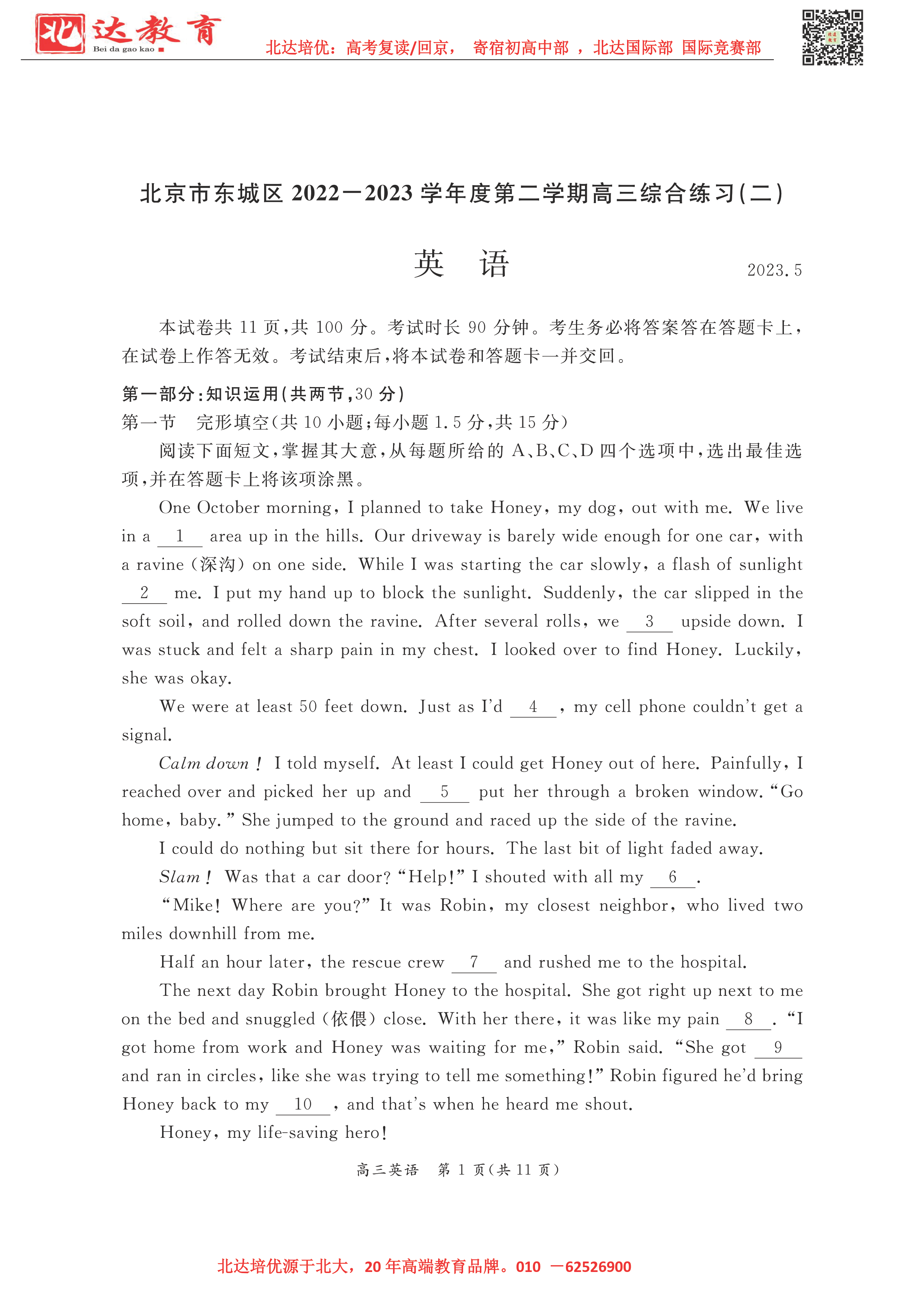 2023年北京东城区高三二模考试预于5月初进行,为了方便同学们查找相关试题及答案,北达高考复读学校整理了2023年北京东城区高三二模英语试题及答案,附高清电子版,欢迎为大家下载分享~