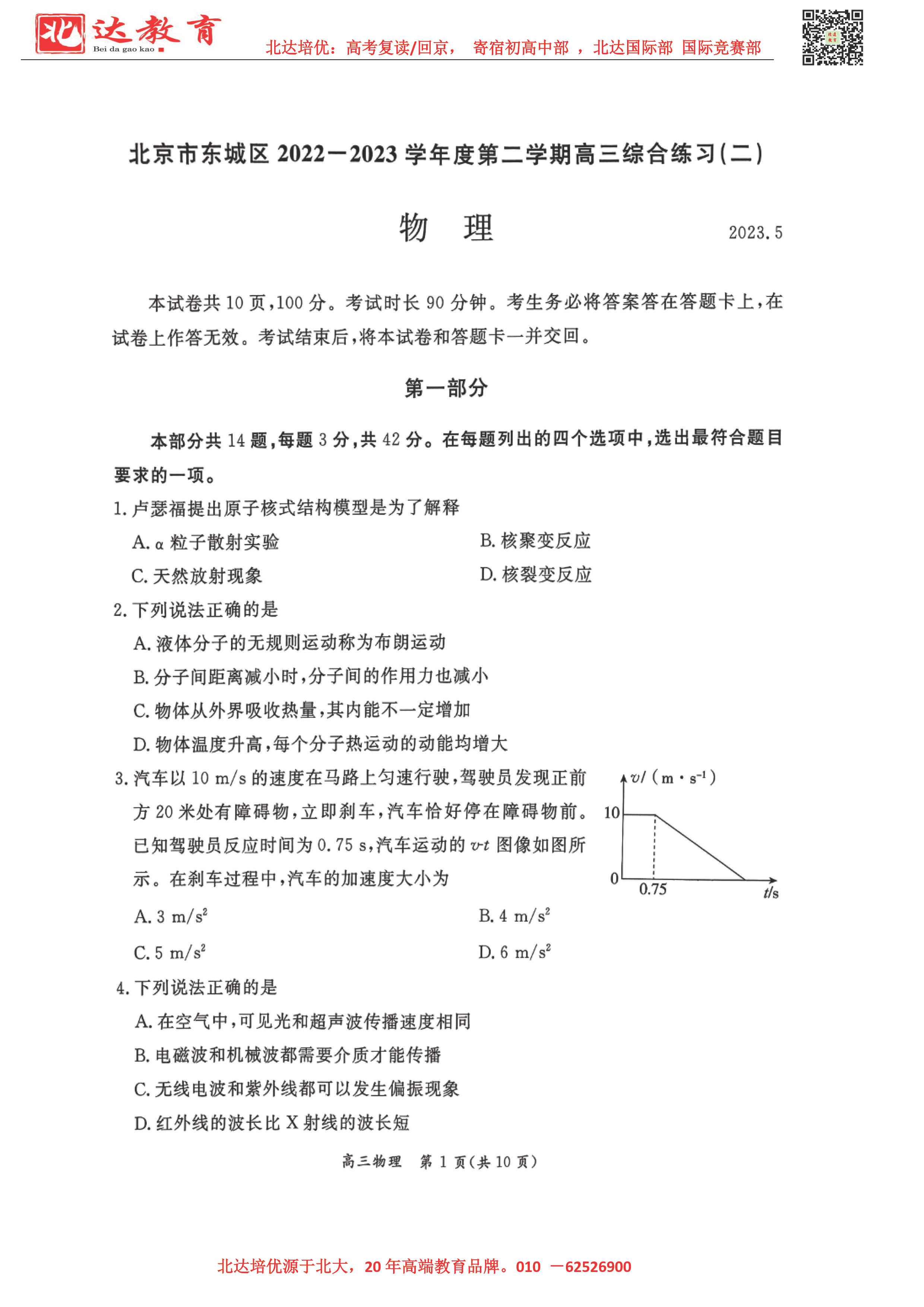 2023年北京东城区高三二模考试预于5月初进行,为了方便同学们查找相关试题及答案,北达高考复读学校整理了2023年北京东城区高三二模物理试题及答案,附高清电子版,欢迎为大家下载分享~