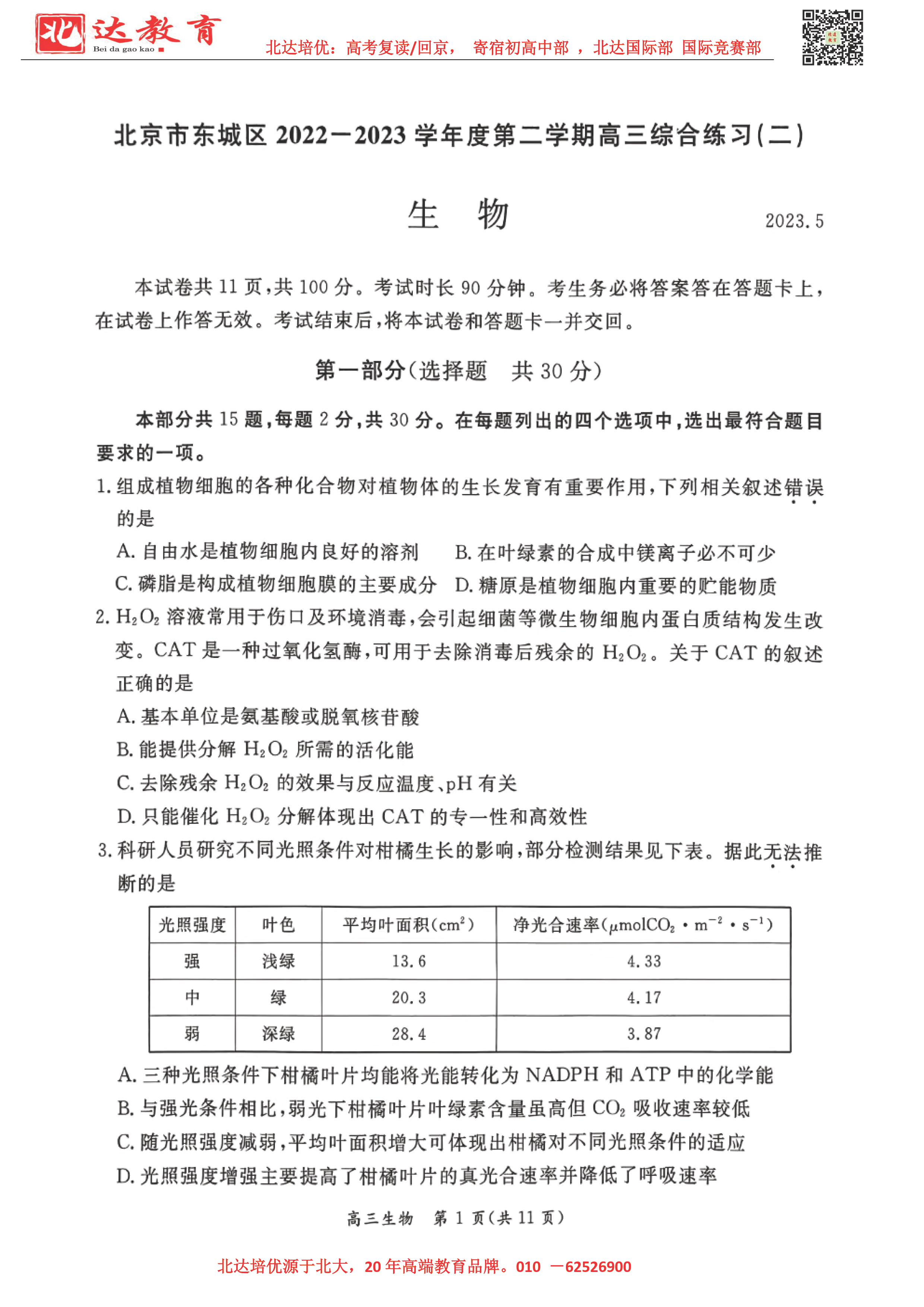 2023年北京东城区高三二模考试预于5月初进行,为了方便同学们查找相关试题及答案,北达高考复读学校整理了2023年北京东城区高三二模生物试题及答案,附高清电子版,欢迎为大家下载分享~