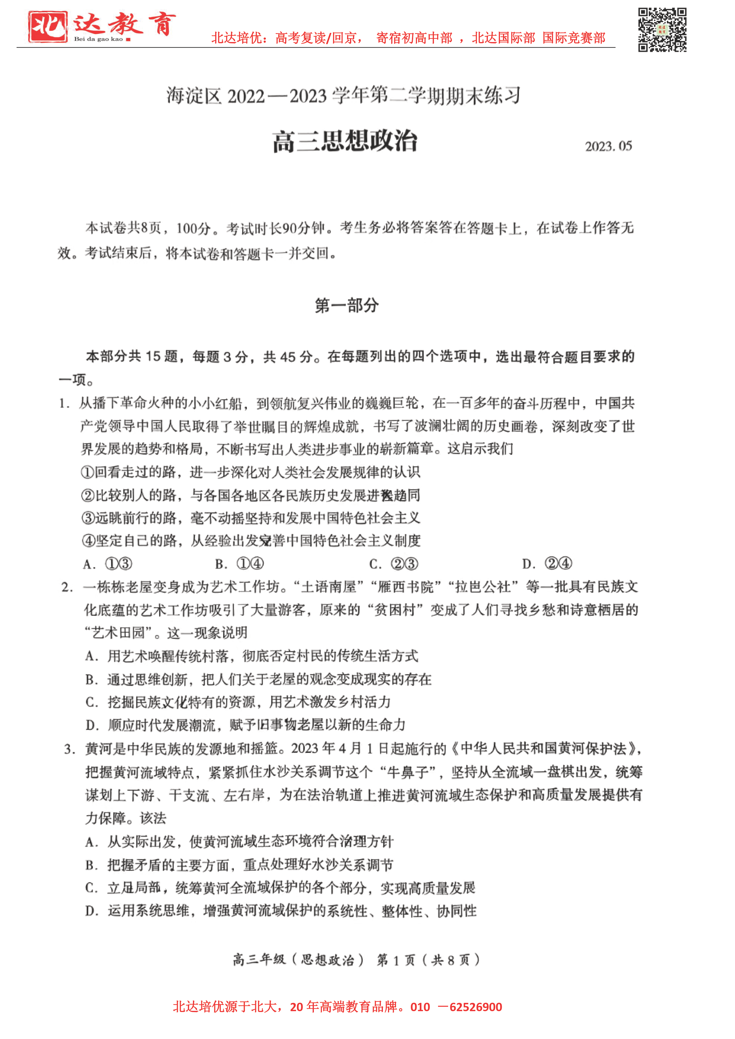 2023年北京东城区高三二模考试预于5月初进行,为了方便同学们查找相关试题及答案,北达高考复读学校整理了2023年北京海淀区高三二模政治试题及答案,附高清电子版,欢迎为大家下载分享~
