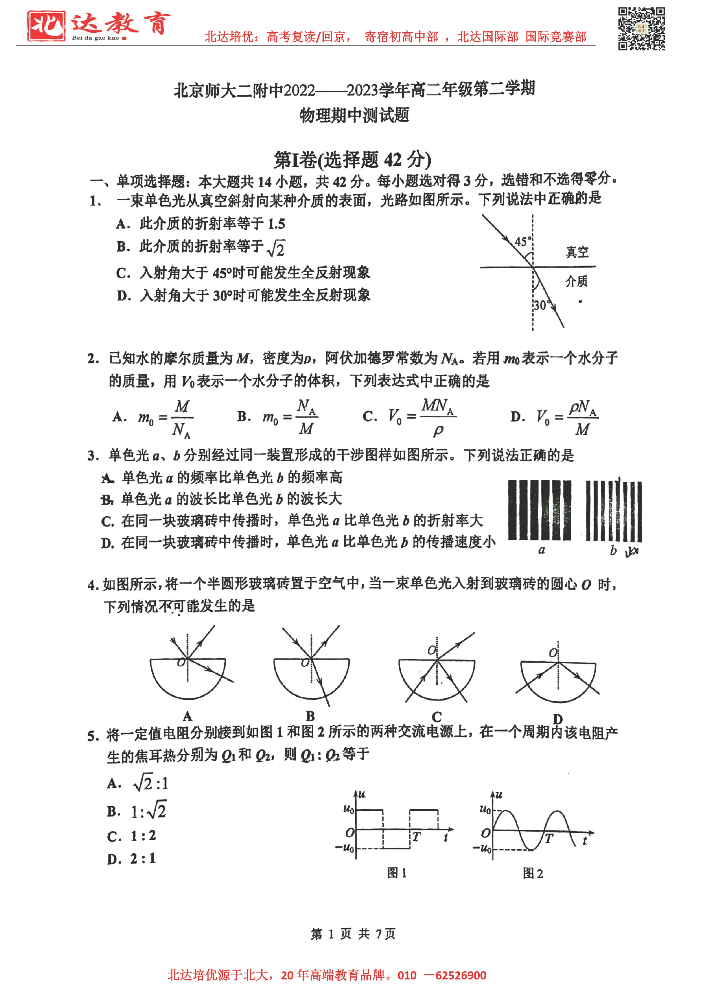 2022-2023学年北京各区高二年级下学期期中考试已开始,北达高考复读学校整理了2022-2023学年北京北师大二附中高二(下)期中物理试题,供同学们在线下载!