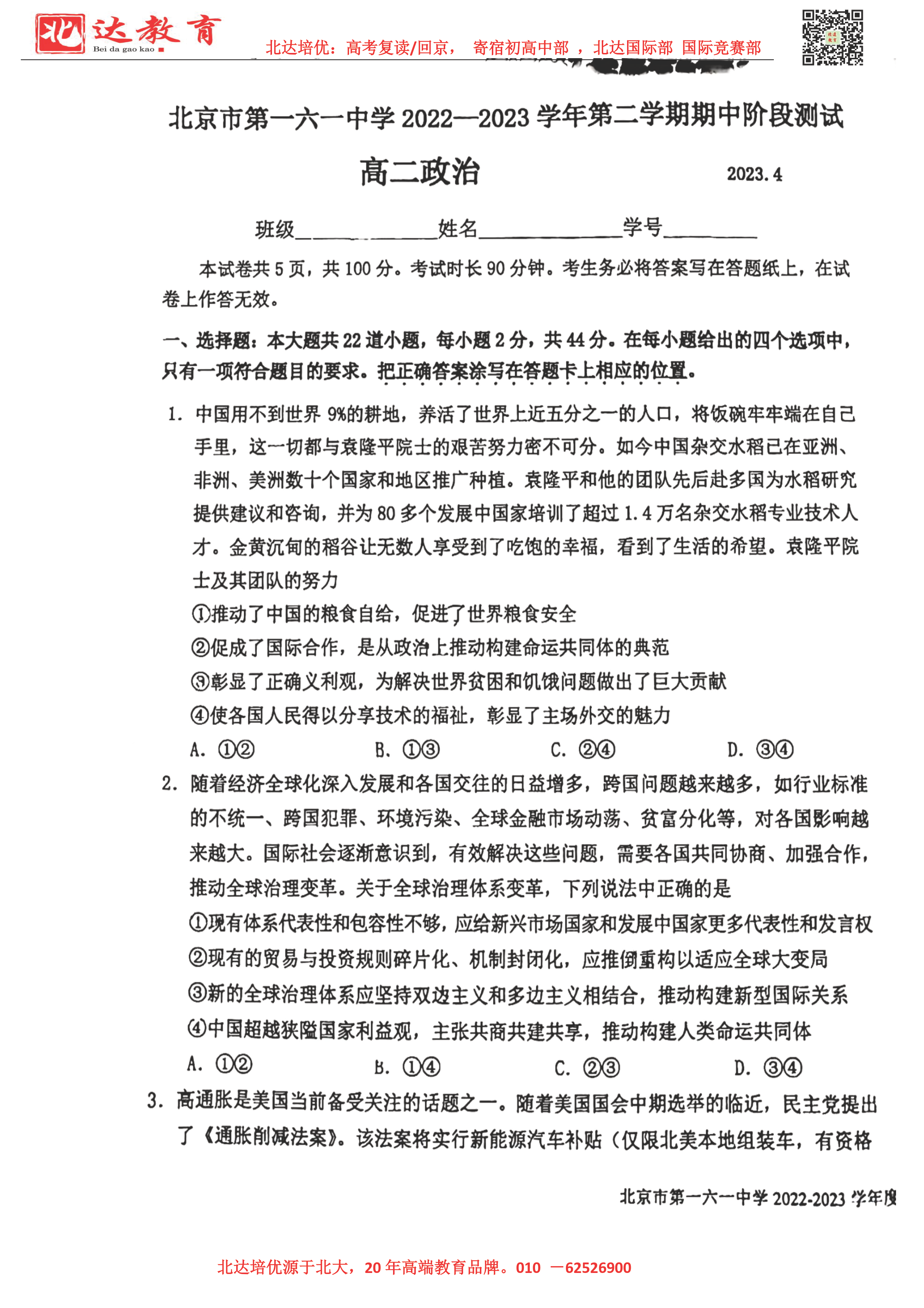 2022-2023学年北京各区高二年级下学期期中考试已开始,北达高考复读学校整理了2022-2023学年北京一六一中高二(下)期中政治试题及答案,供同学们在线下载!