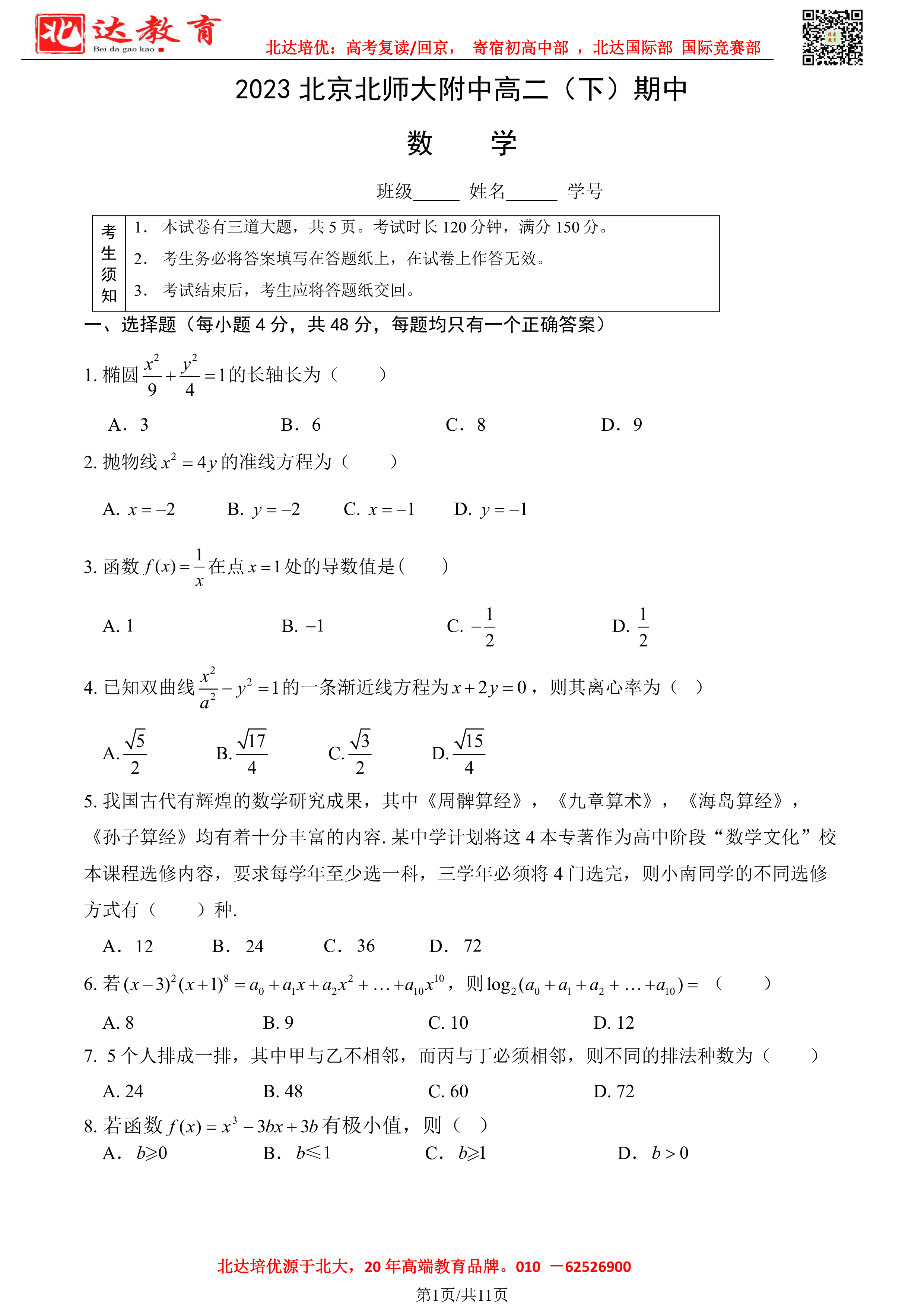 2022-2023学年北京各区高二年级下学期期中考试已开始,北达高考复读学校整理了2022-2023学年北师大附中高二(下)期中数学试题及答案,供同学们在线下载!