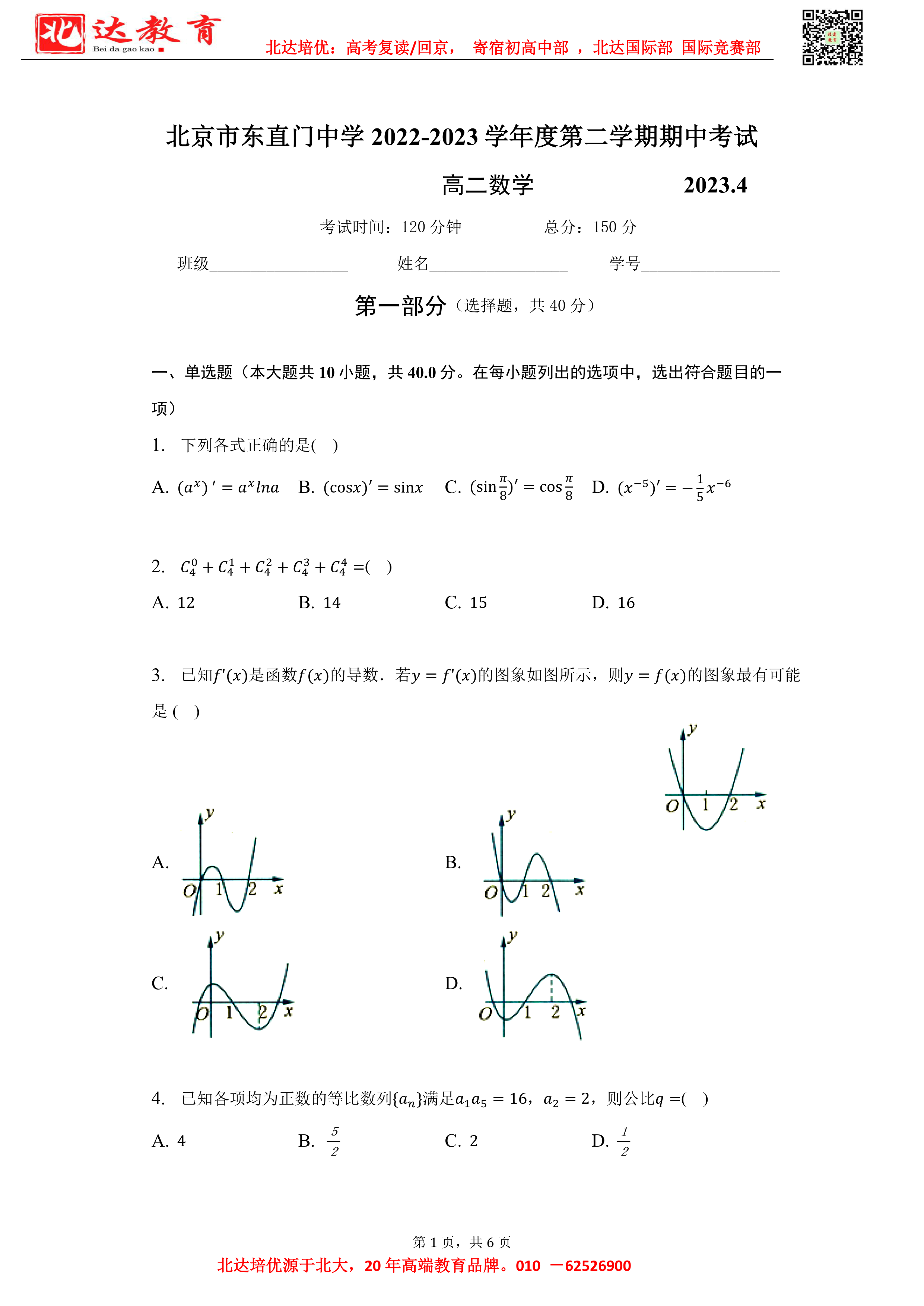 2022-2023学年北京各区高二年级下学期期中考试已开始,北达高考复读学校整理了2022-2023学年北京东直门中学高二(下)期中数学试题,供同学们在线下载!