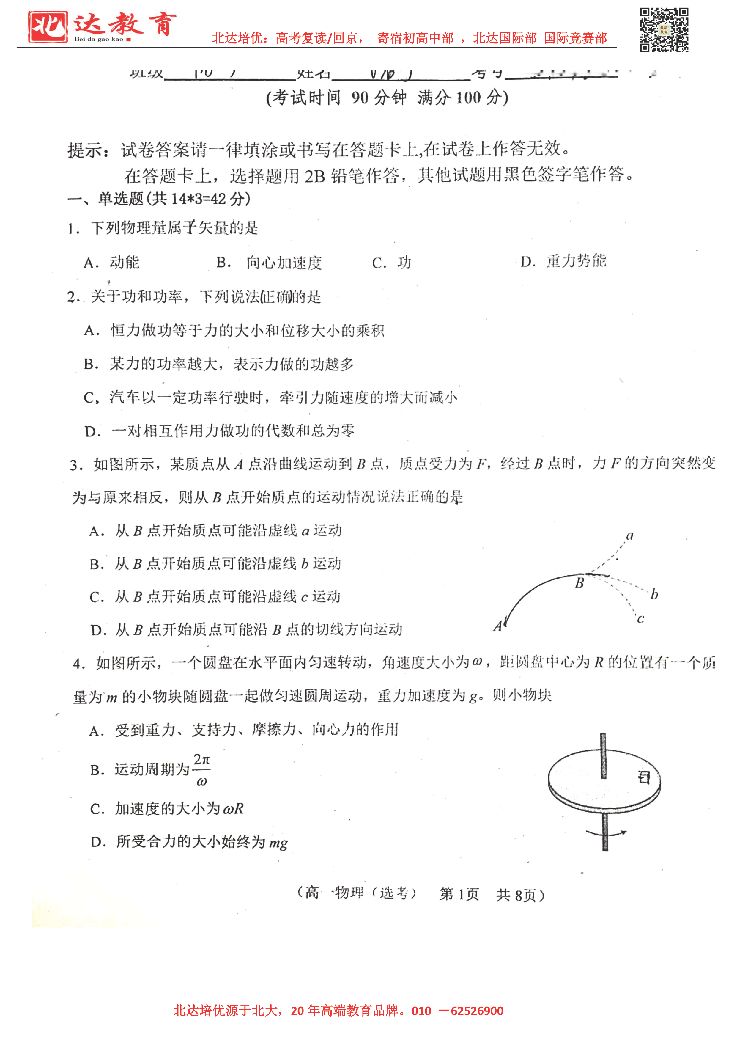 2022-2023学年北京各区高一年级下学期期中考试已开始,北达高考复读学校整理了2022-2023学年北京八十中高一(下)期中物理试题,供同学们在线下载!