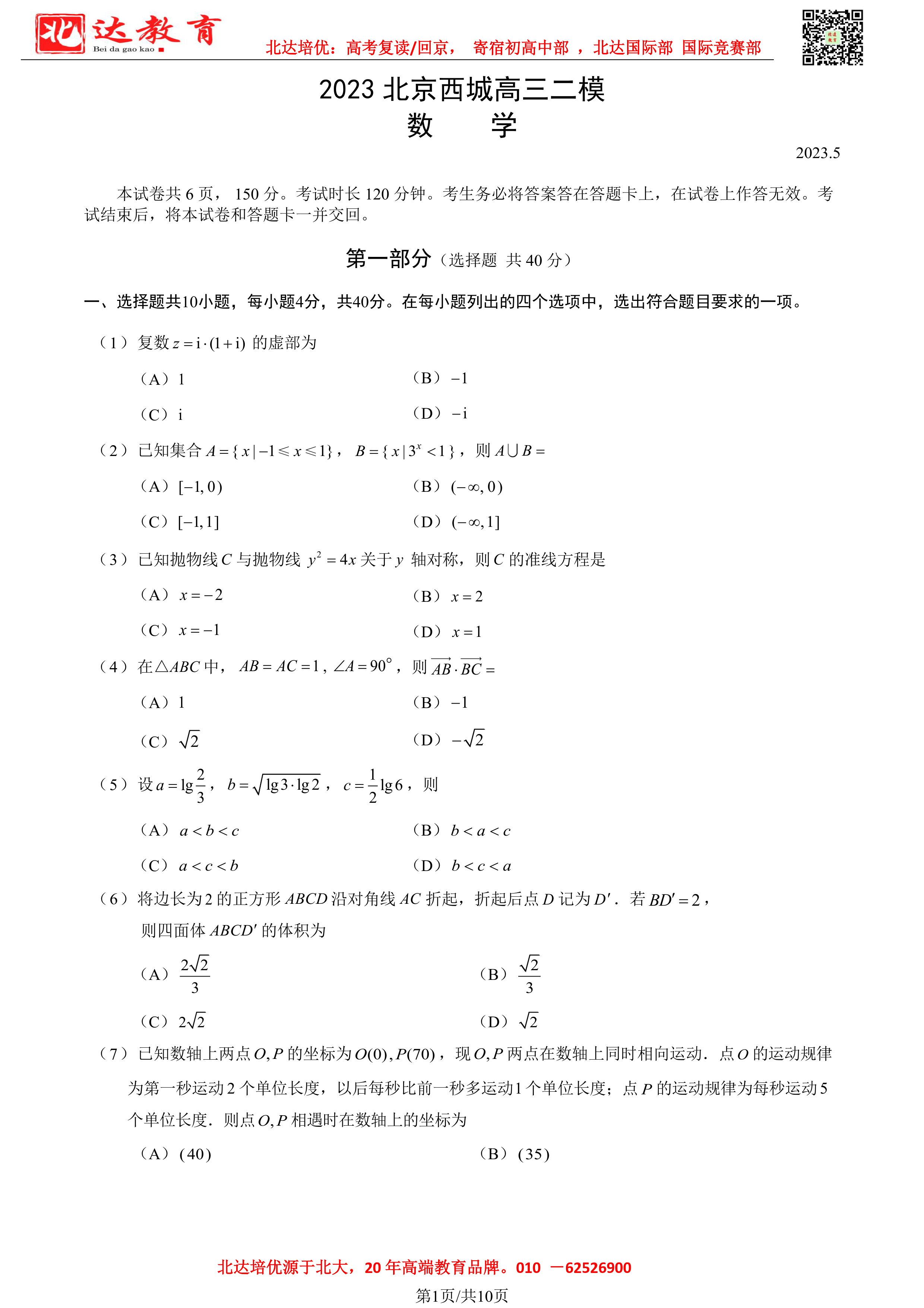 2023年北京西城区高三二模考试预于5月初进行,为了方便同学们查找相关试题及答案,北达高考复读学校整理了2023年北京西城区高三二模数学试题及答案,附高清电子版,欢迎为大家下载分享~