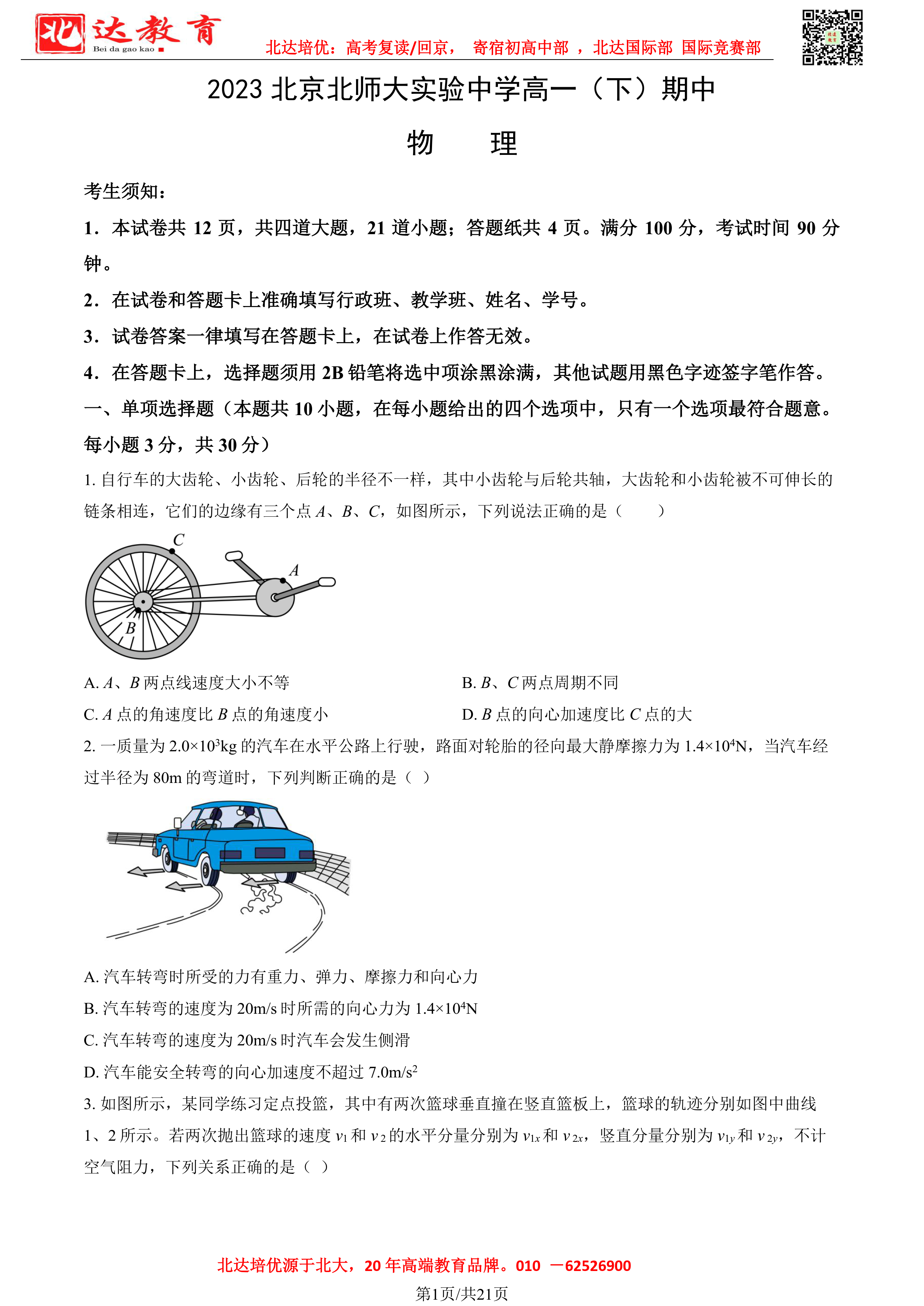 2022-2023学年北京各区高一年级下学期期中考试已开始,北达高考复读学校整理了2022-2023学年北京北师大实验中学高一(下)期中物理试题,供同学们在线下载!