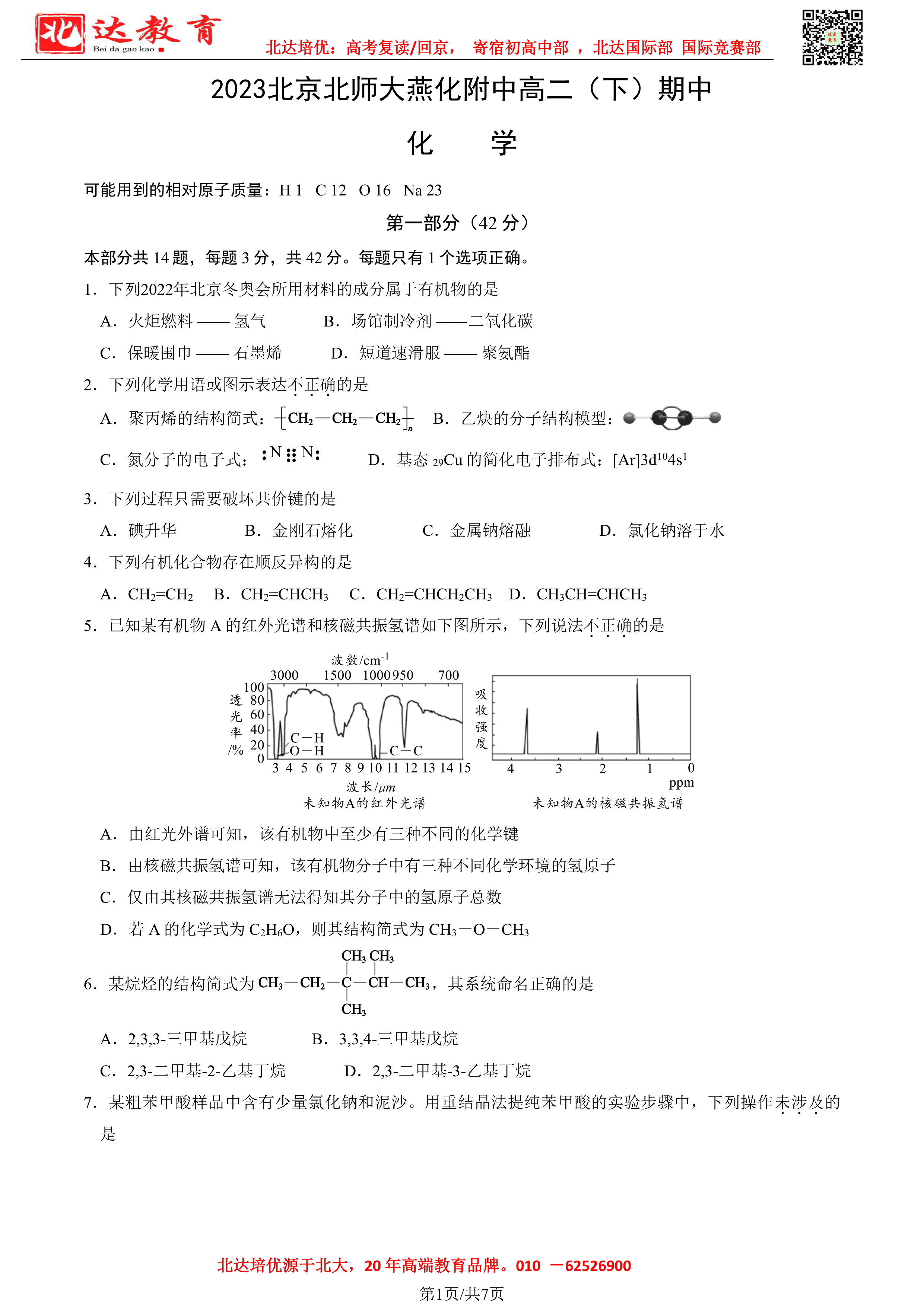2022-2023学年北京各区高一年级下学期期中考试已开始,北达高考复读学校整理了2022-2023学年北京北师大燕化附中高二(下)期中化学试题及答案,供同学们在线下载!
