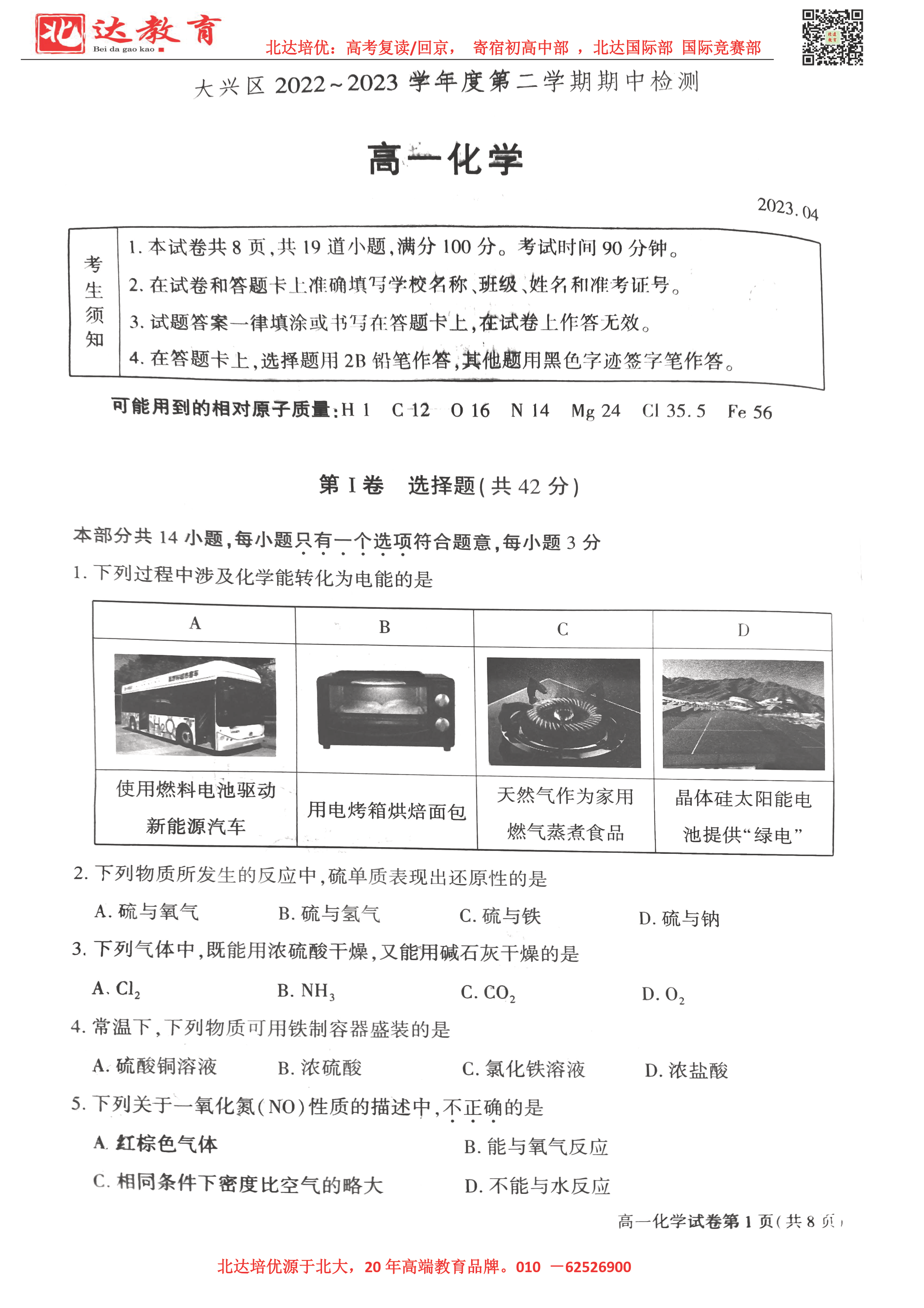 2022-2023学年北京各区高一年级下学期期中考试已开始,北达高考复读学校整理了2022-2023学年北京大兴区高一(下)期中化学试题及答案,供同学们在线下载!