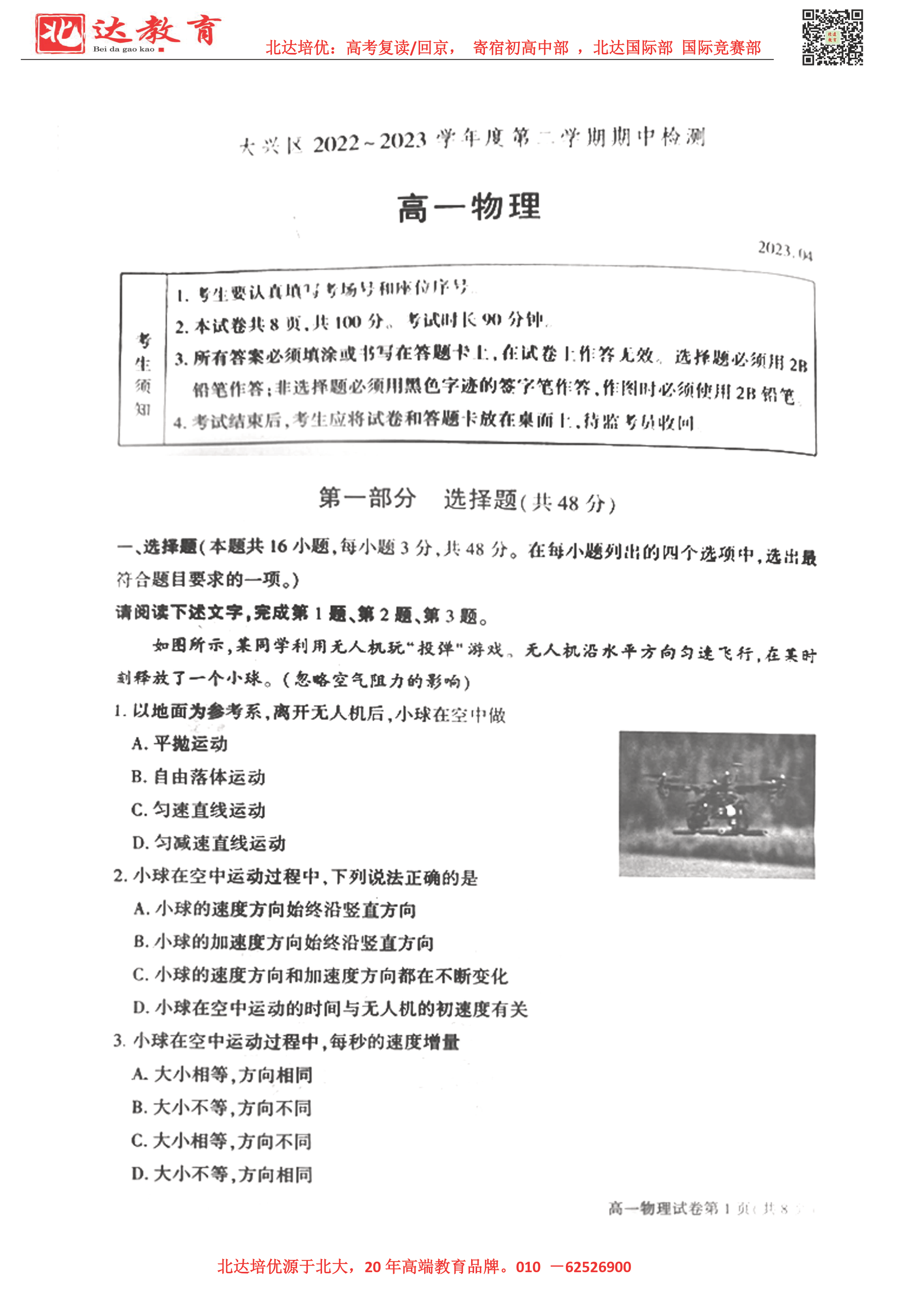 2022-2023学年北京各区高一年级下学期期中考试已开始,北达高考复读学校整理了2022-2023学年北京大兴区高一(下)期中物理试题,供同学们在线下载!