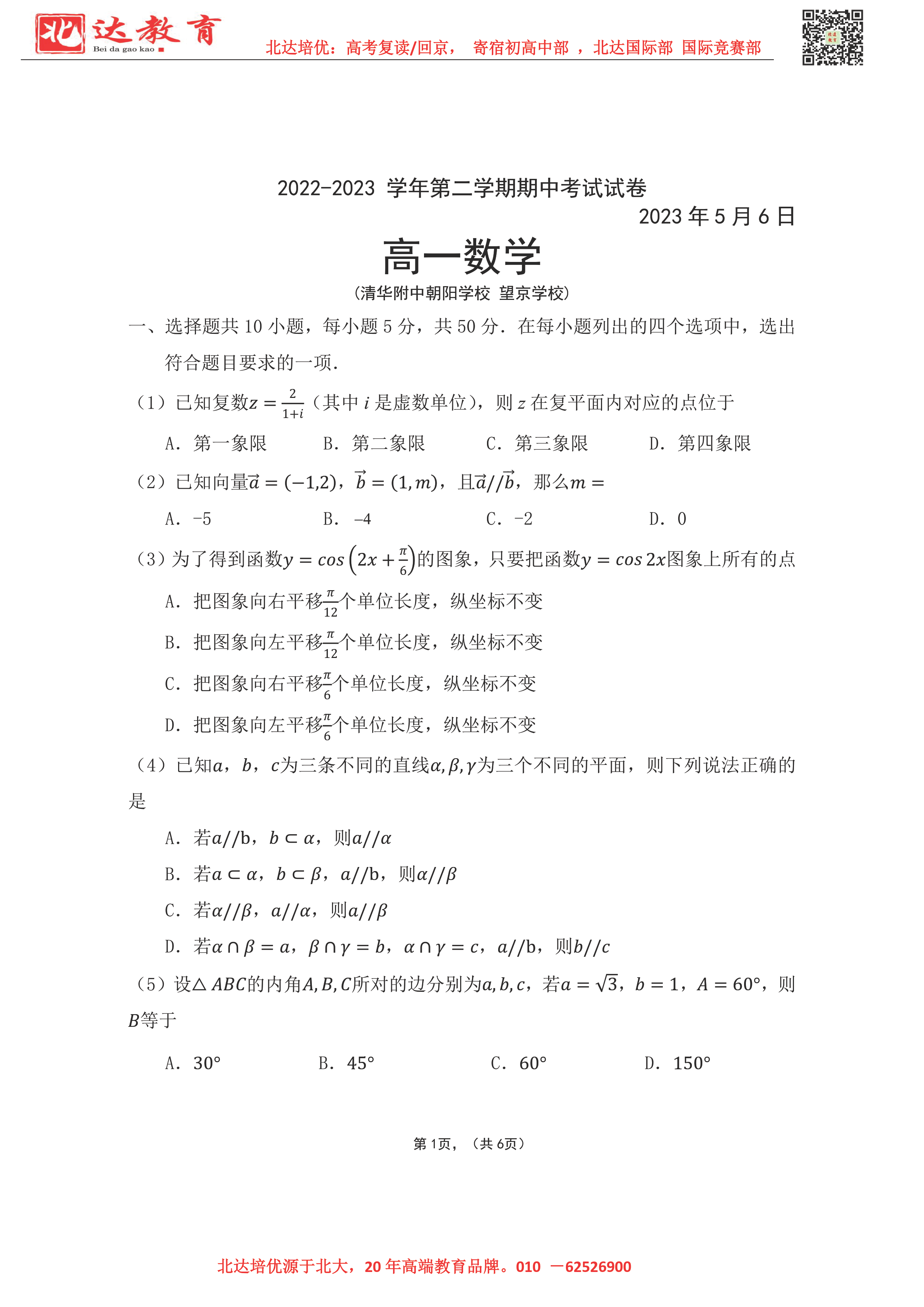2022-2023学年北京各区高一年级下学期期中考试已开始,北达高考复读学校整理了2022-2023学年北京清华附中朝阳、望京学校高一(下)期中数学试题及答案,供同学们在线下载!